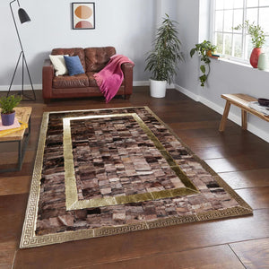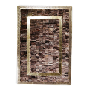 Kahverengi Patchwork Desenli Toskana Derisi Halı – Altın Çerçeveli ve Bordürlü, El Yapımı Hakiki Deri Halı