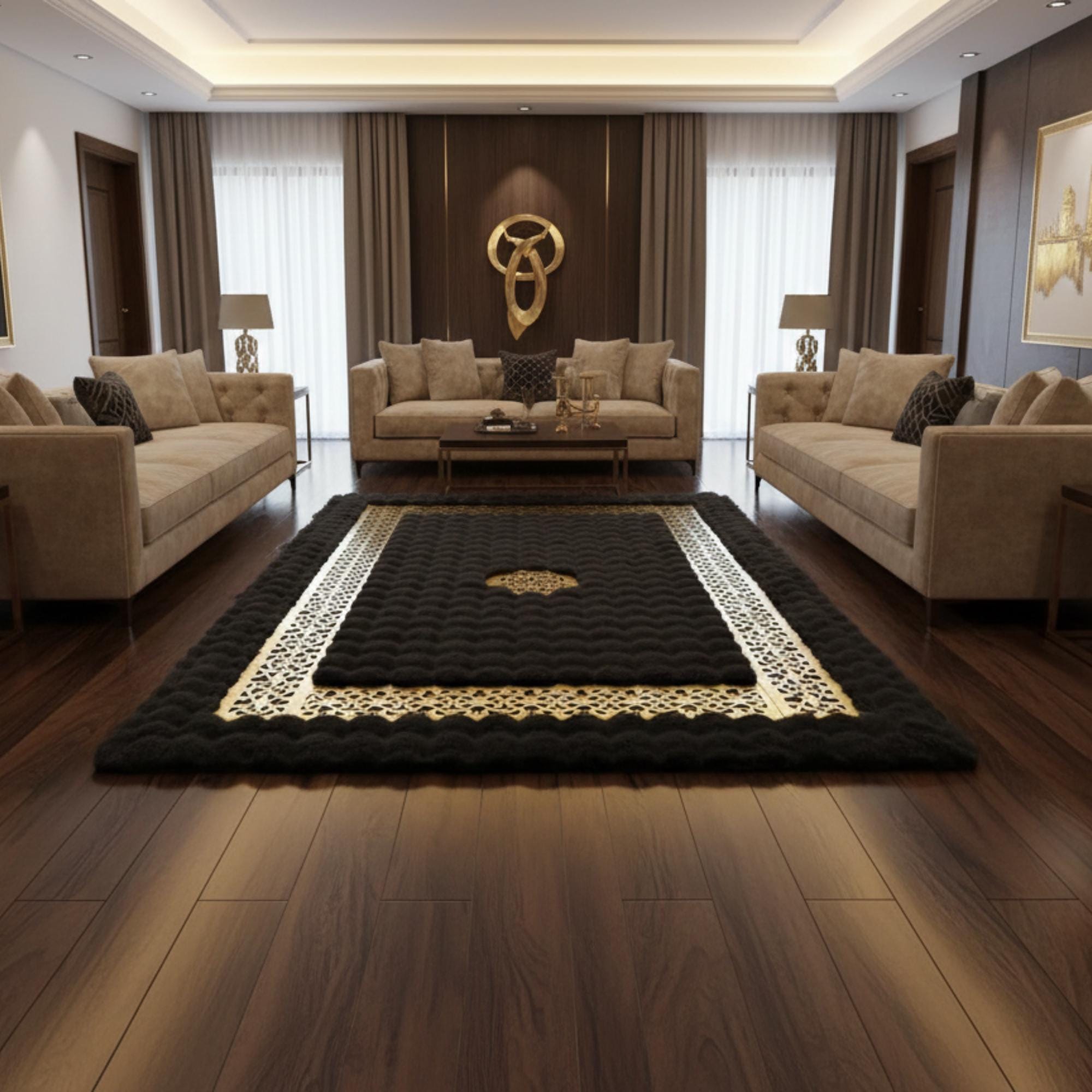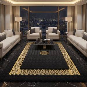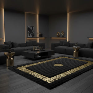 Siyah zemin üzerine merkezde dokulu yüzey ve çevresini saran altın geometrik bordür detaylarıyla tasarlanan bu peluş halı, güçlü kontrastı ve net çerçeve yapısıyla mekâna prestijli bir görünüm kazandırır. Bordür boyunca devam eden geometrik desen, halının sınırlarını belirginleştirirken merkezdeki dokulu alan derinlik hissi oluşturur.