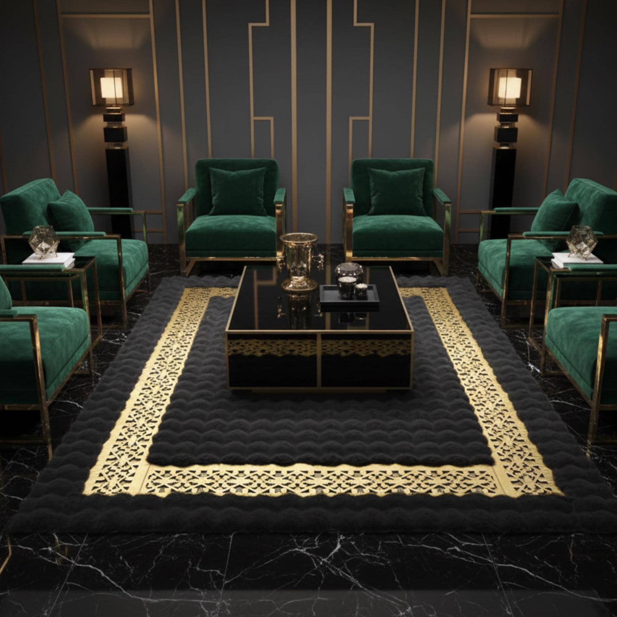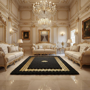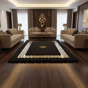 Siyah Zeminli Altın Geometrik Bordürlü Peluş Halı
