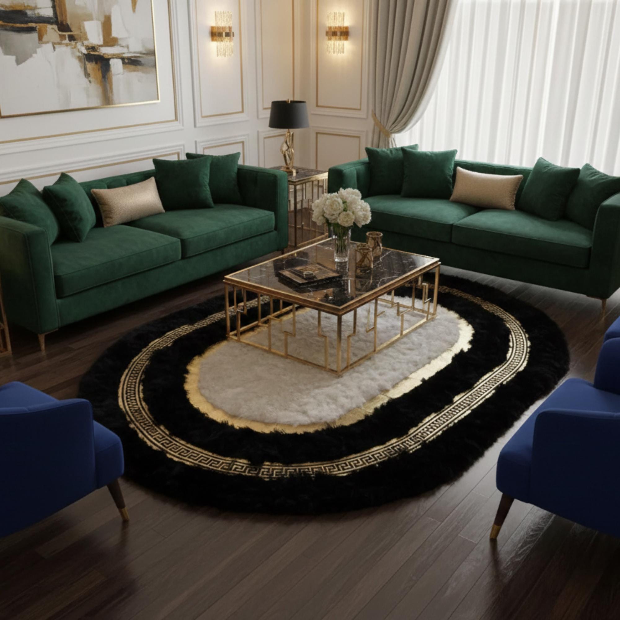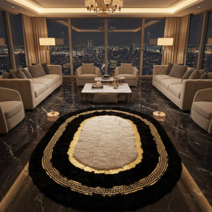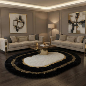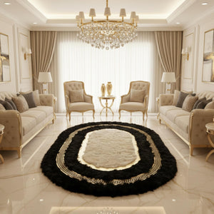Siyah zemin üzerine oval formda tasarlanan bu peluş halı, merkezde yer alan beyaz alanı ve çevresini saran altın motifli bordür detaylarıyla güçlü bir kontrast sunar. Oval form, mekânda akıcı ve yumuşak bir geçiş hissi yaratırken, altın motif bordür halının sınırlarını belirginleştirerek dengeli bir görünüm kazandırır.