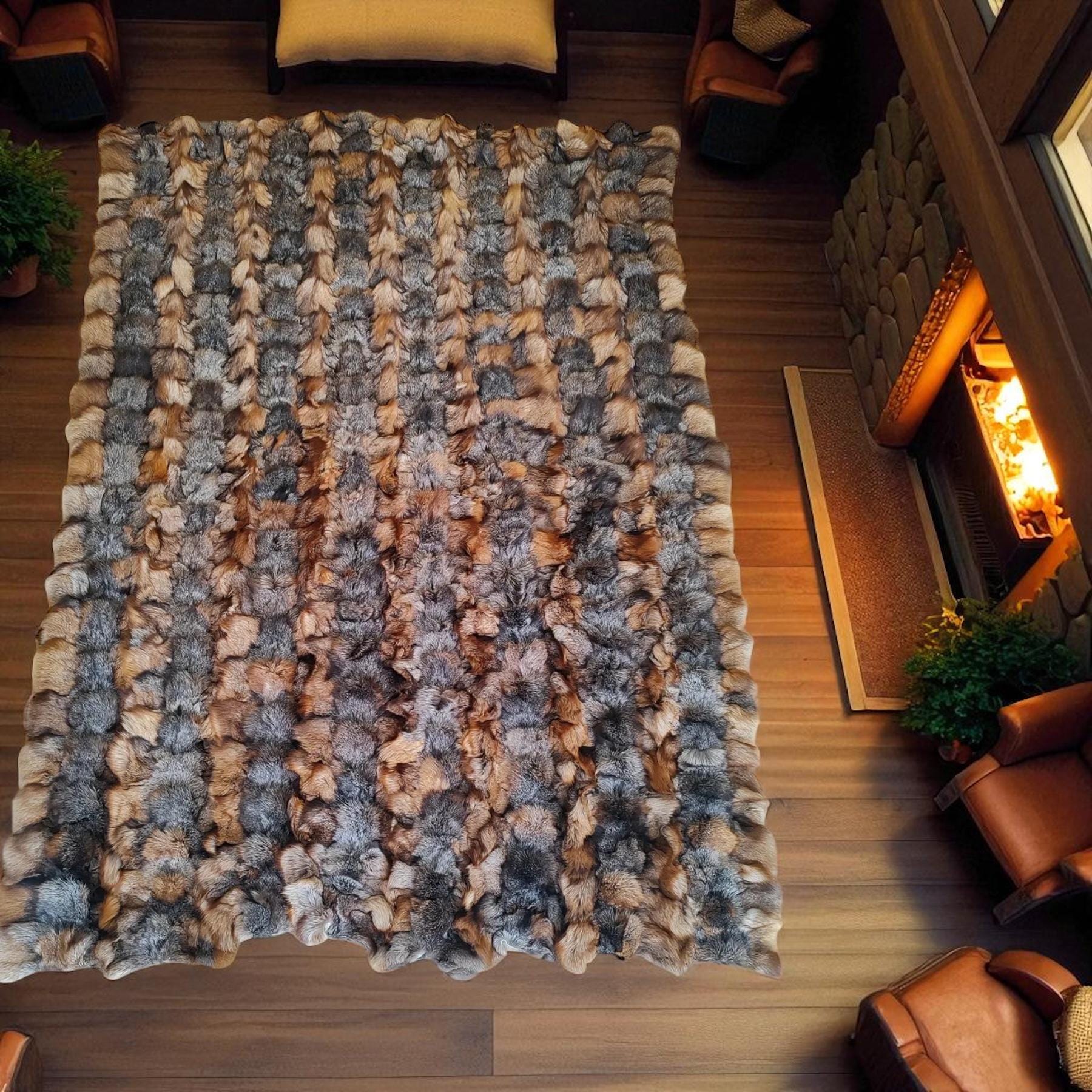 Kahverengi Gri Tilki Kürkü Halı – El Yapımı Doğal Kürk Lüks Salon Halısı