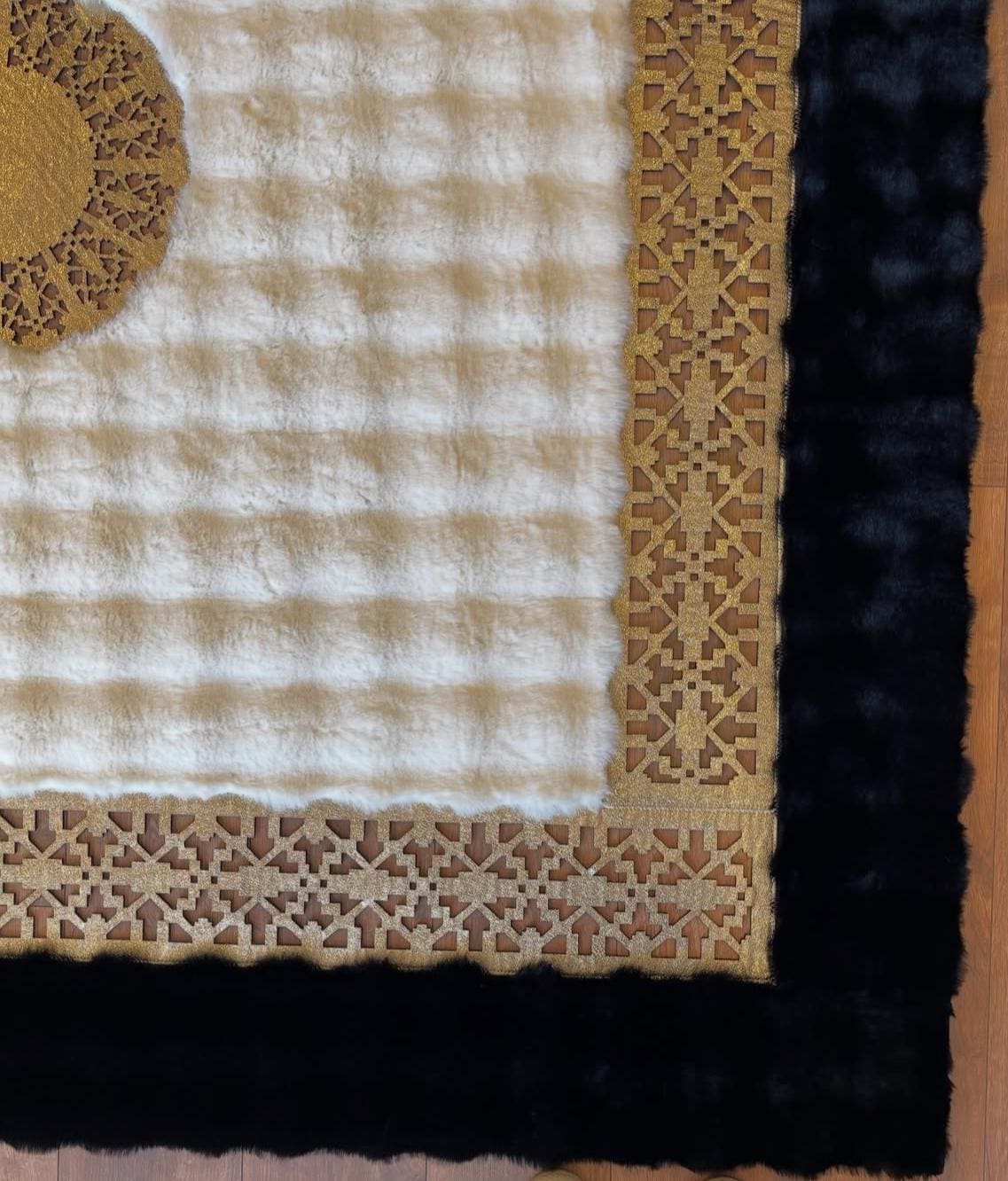 Bu siyah kenarlı, altın bordürlü ve merkez desenli peluş halı, modern şıklığıyla öne çıkar. Yumuşak dokusu ve dayanıklı yapısıyla uzun süreli kullanım sunar.