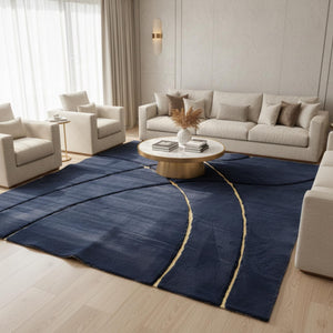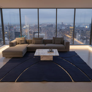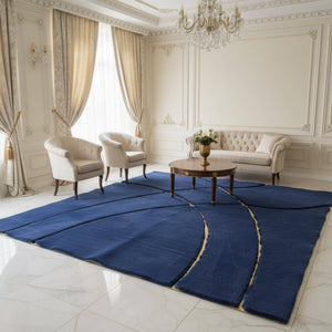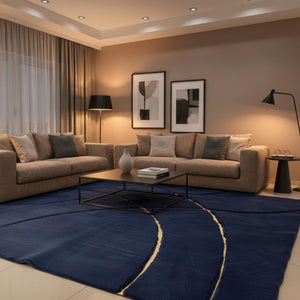 Lacivert zemin üzerine altın geometrik desenlerle tasarlanan bu peluş halı, net çizgileri ve güçlü renk kontrastıyla mekâna modern ve karakterli bir görünüm kazandırır. Geometrik desen düzeni halıya dinamik bir yapı katarken, altın detaylar lacivert zemin üzerinde dengeli ve dikkat çekici bir vurgu oluşturur.