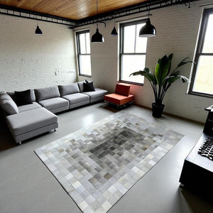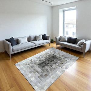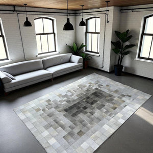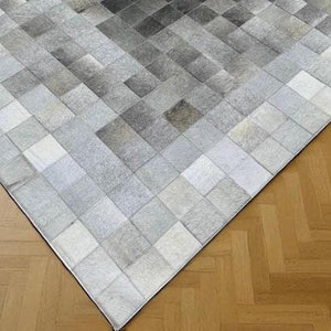 Gri & doğal tonlara sahip bu dana derisi halı, doğal dokusu ve şık görünümüyle dikkat çeker.