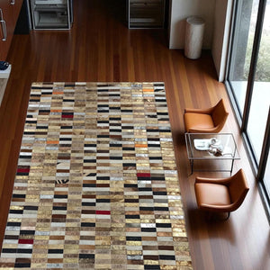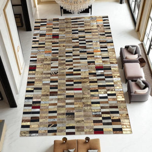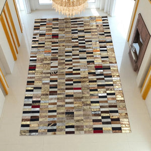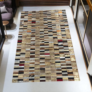 Altın Gümüş Dana Derisi Patchwork Halı – El Yapımı Işıltılı Lüks Salon Halısı