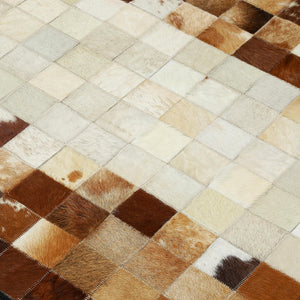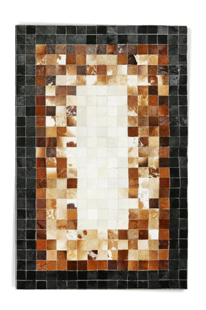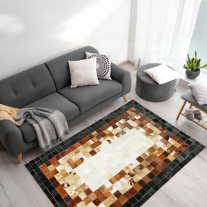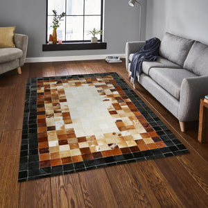 Doğal Tonlarda Siyah Kahverengi Dana Derisi Halı – El Dokuma Gerçek Deri Patchwork Giriş Halısı