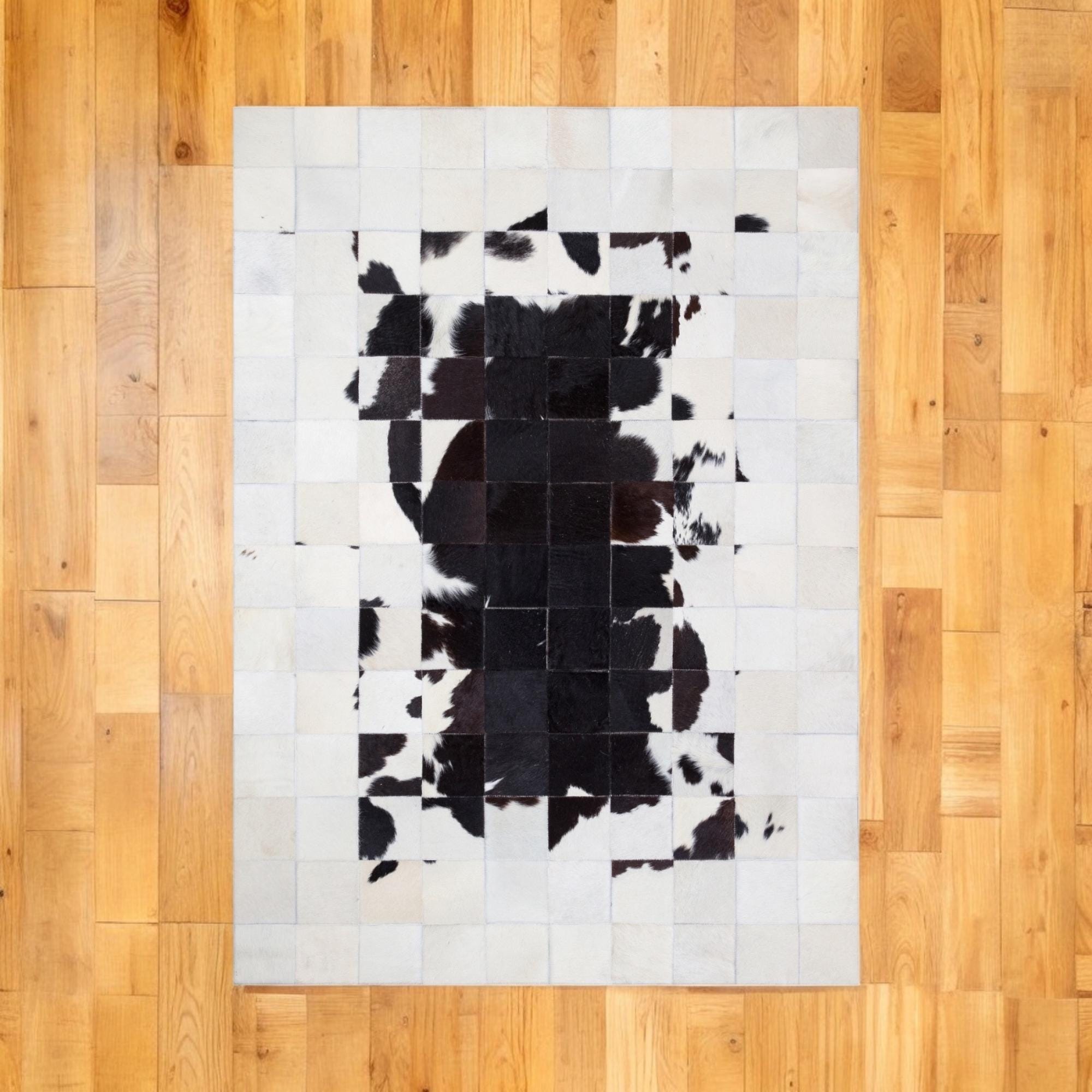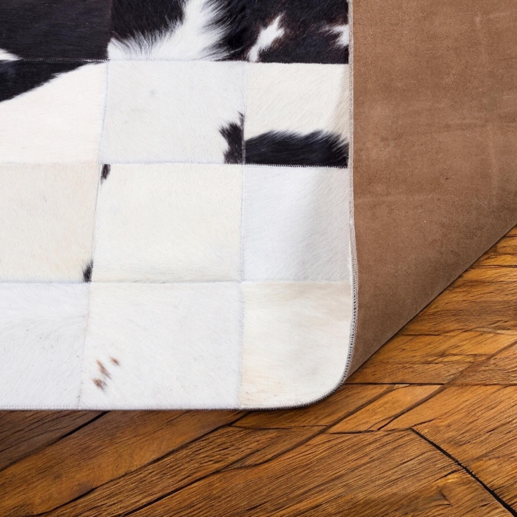 Doğal Beyaz Siyah Dana Derisi Patchwork Halı – El Dokuma Hakiki Deri Modern Salon Halısı