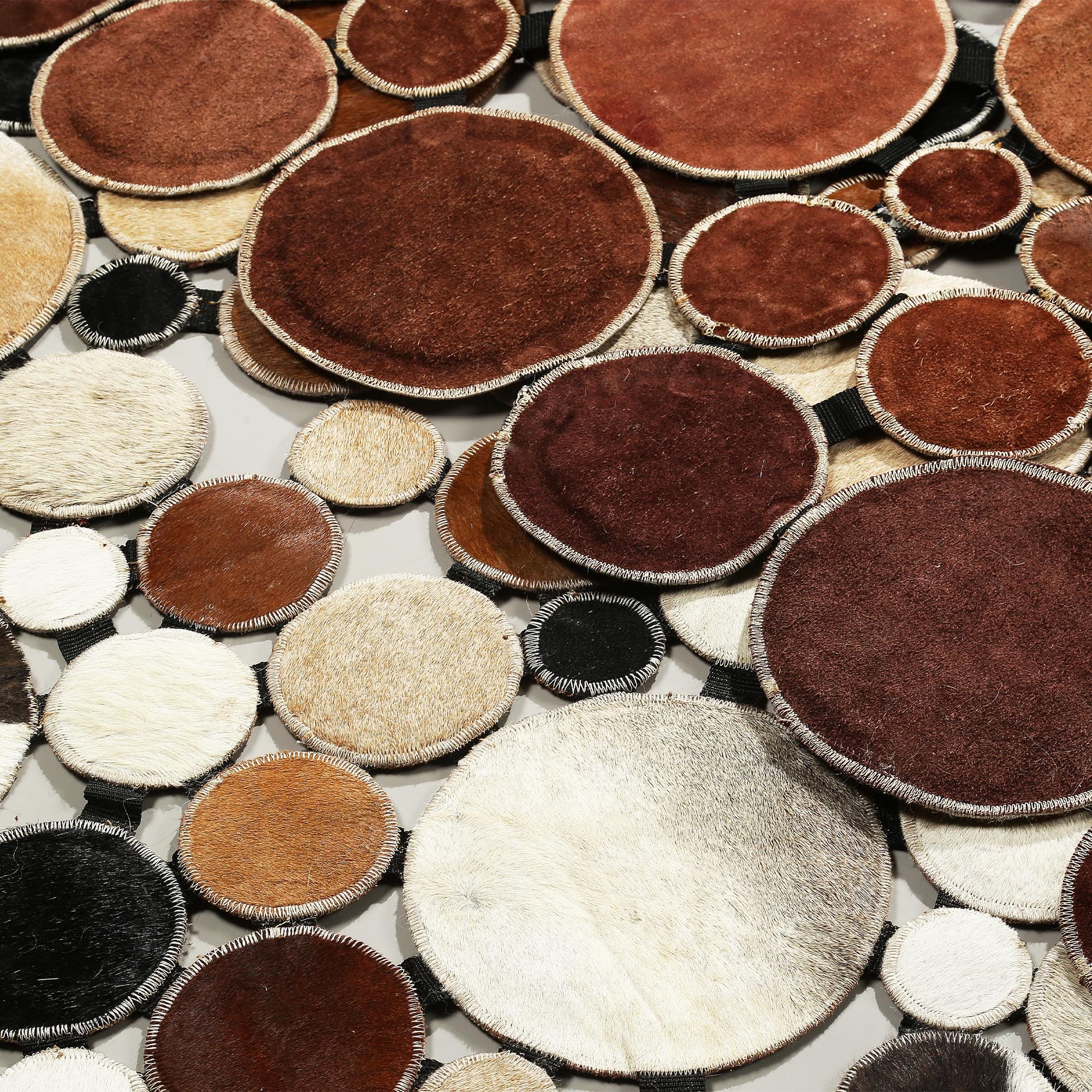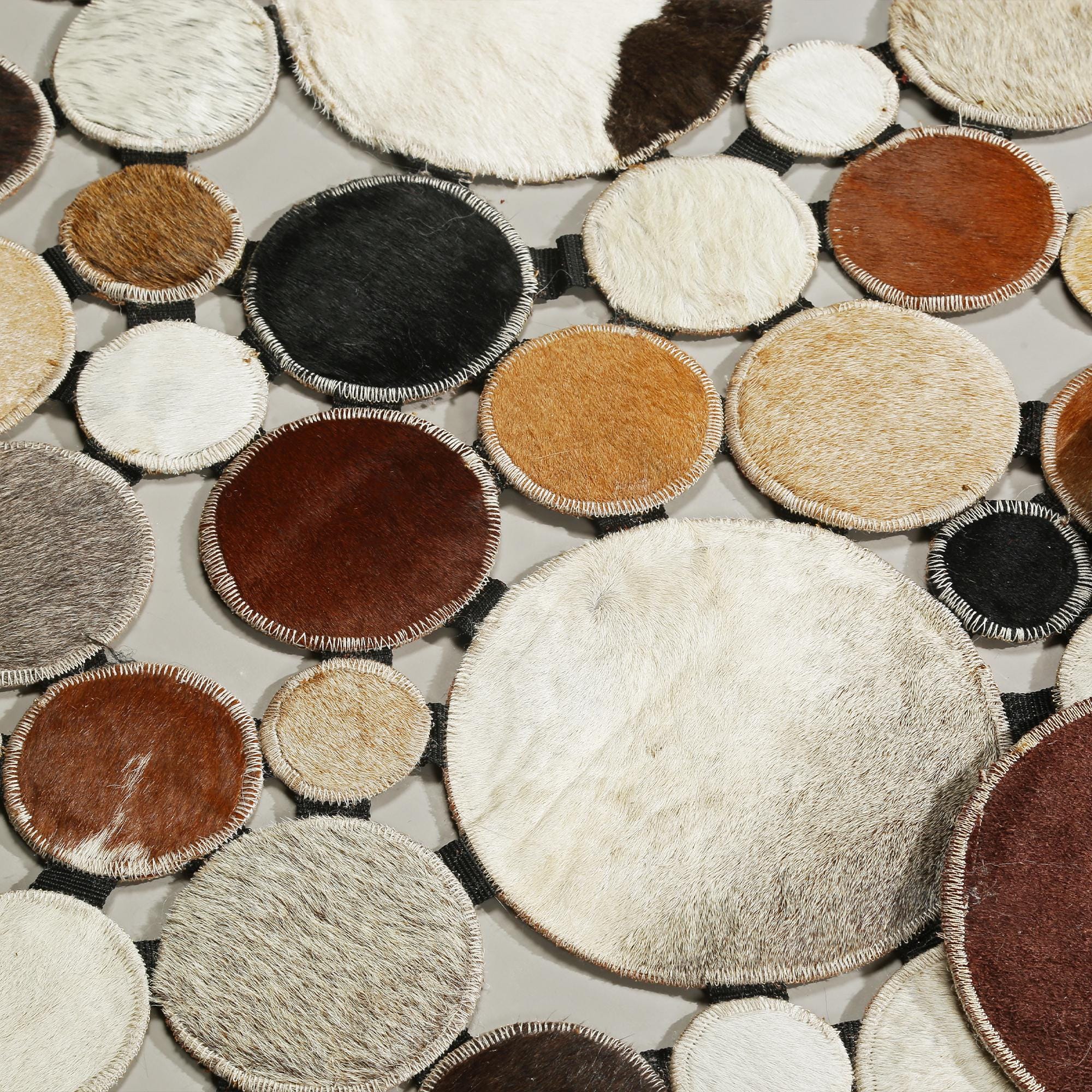 Doğal kahve tonlarındaki bu dana derisi halı, puantiye deseniyle rustik ve modern stilleri birleştirir.