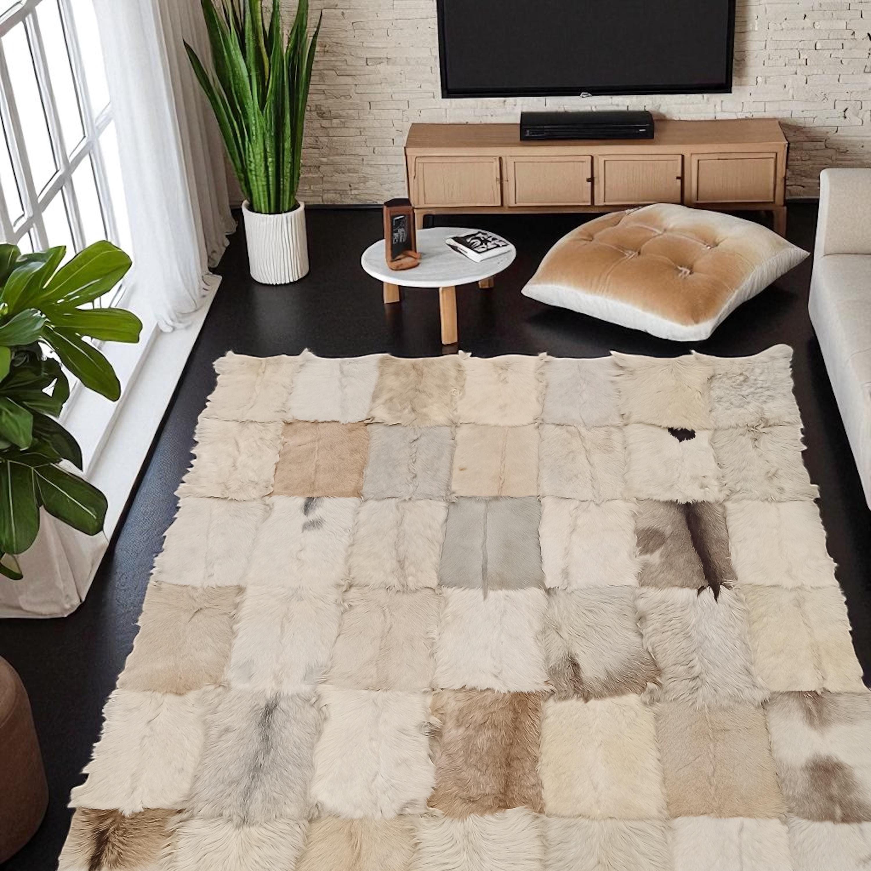 Açık Renk Patchwork Oğlak Derisi Halı – El Yapımı Doğal Deri Halı, Beyaz ve Krem Tonlarında Lüks Dekoratif Halı