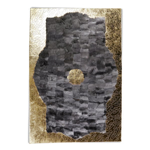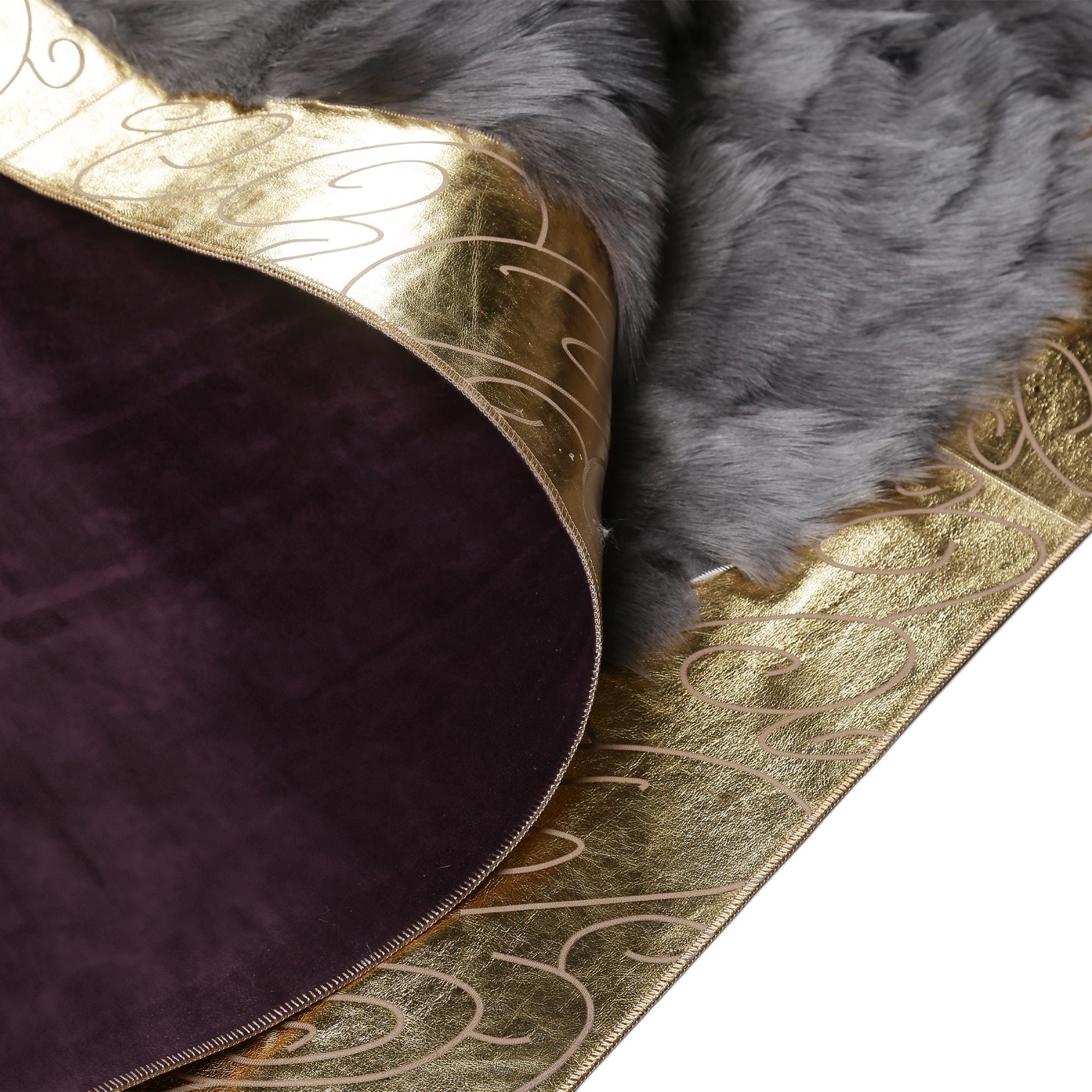 Gri zemin üzerine altın kenar desenleri ve merkezinde daire motifiyle tasarlanan bu Toskana derisi halı, zarif ve dikkat çekici bir görünüm sunar. El işçiliğiyle üretilmiş olup doğal deriden yapılmıştır.