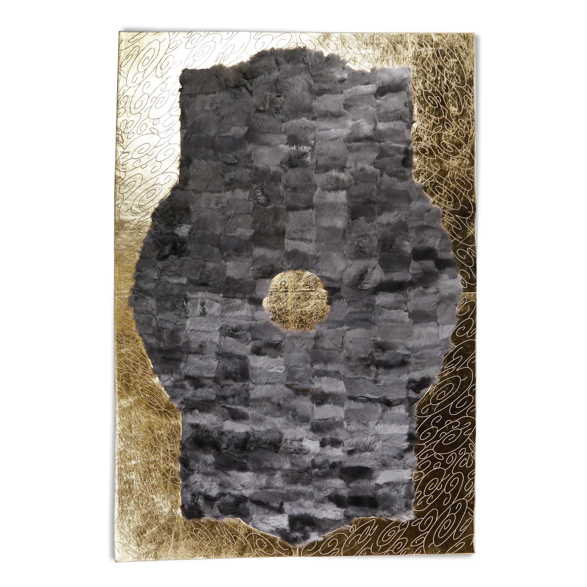 Toskana Derisi Halı – Gri Zeminli, Altın Kenar Desenli, El İşçiliği Patchwork, Doğal Deriden Özel Ölçü Lüks Halı