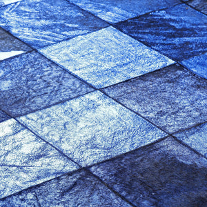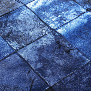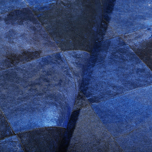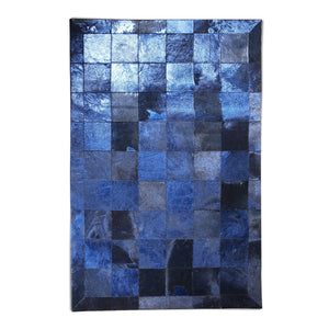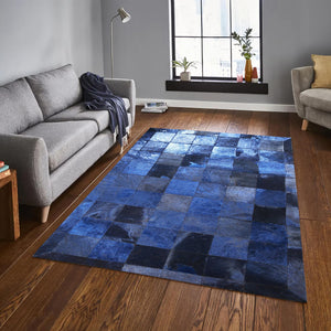 Mavi Tonlarında Kare Desenli Patchwork Gerçek Dana Derisi Halı
