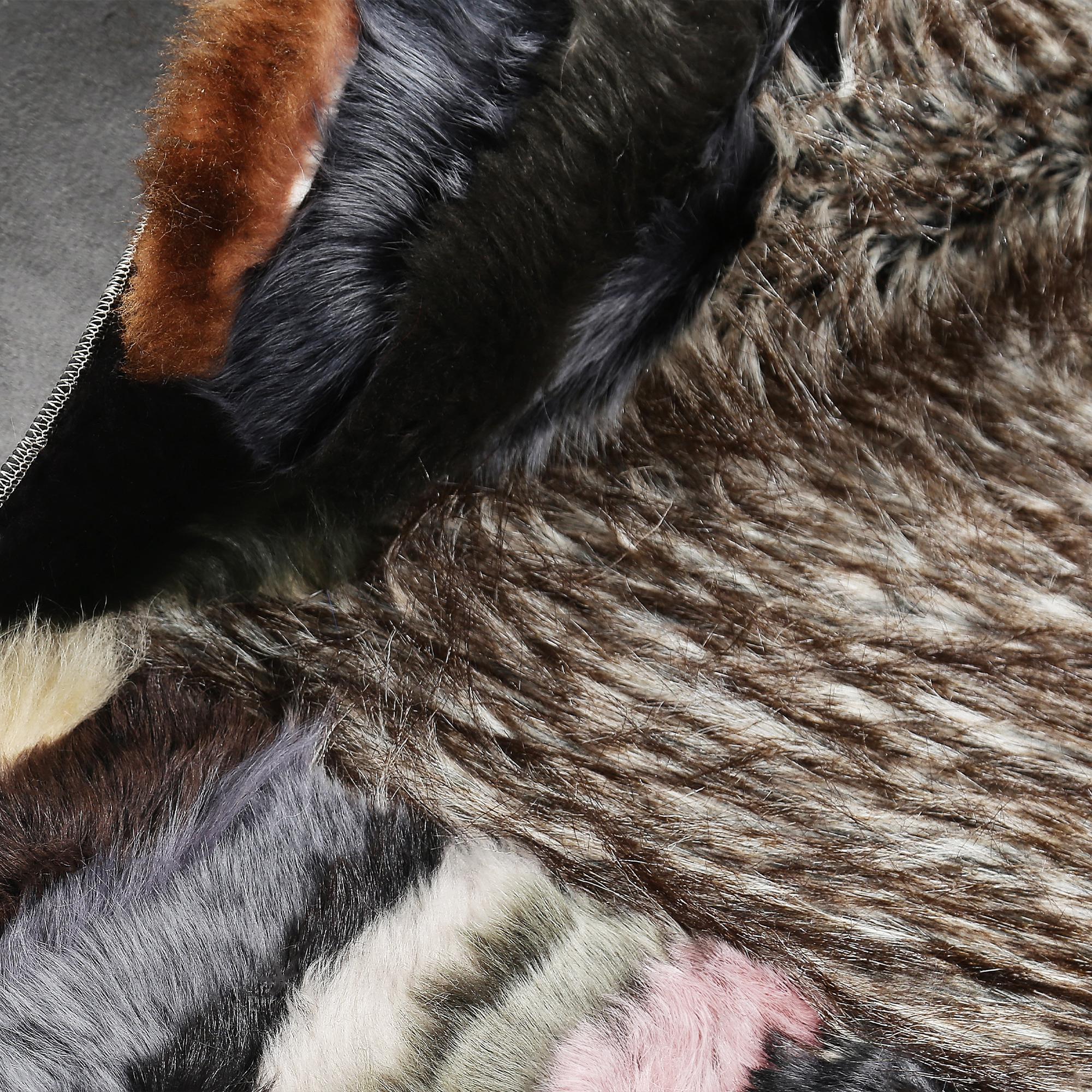 Açık kahverengi Toskana derisinin doğal dokusu ile üretilmiştir. Çevresindeki çok renkli patchwork kenar detayları halıya özgün bir görünüm katar.