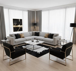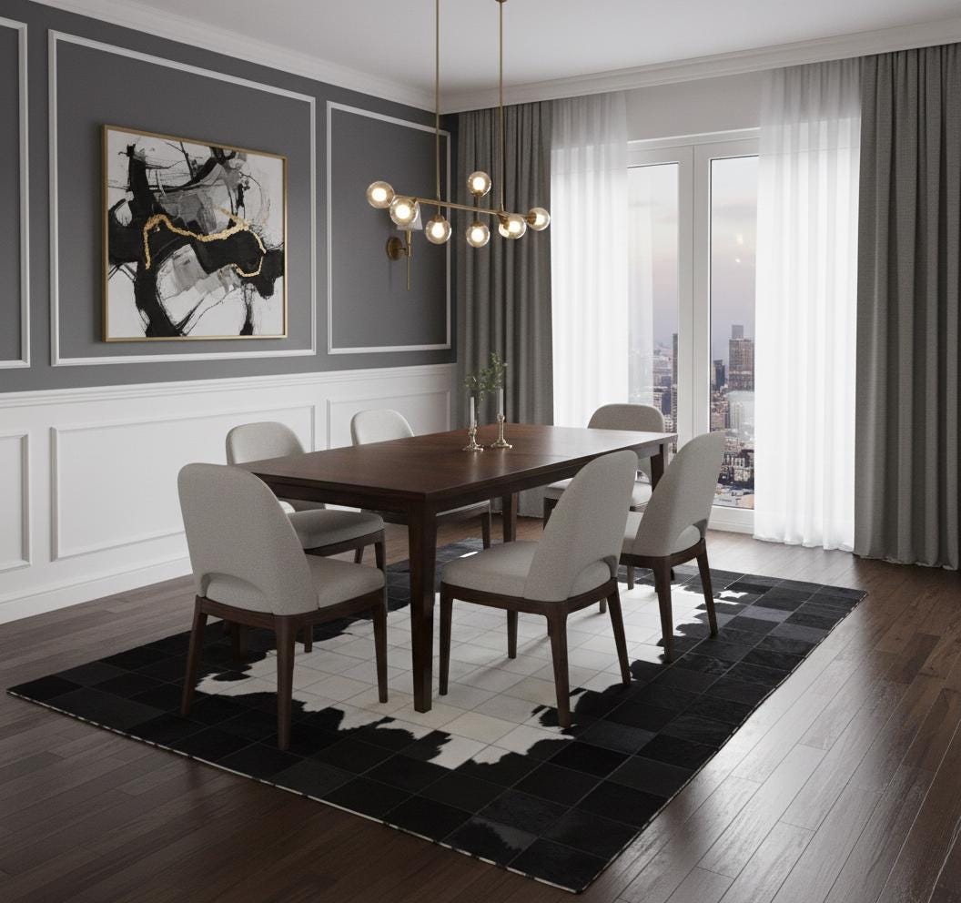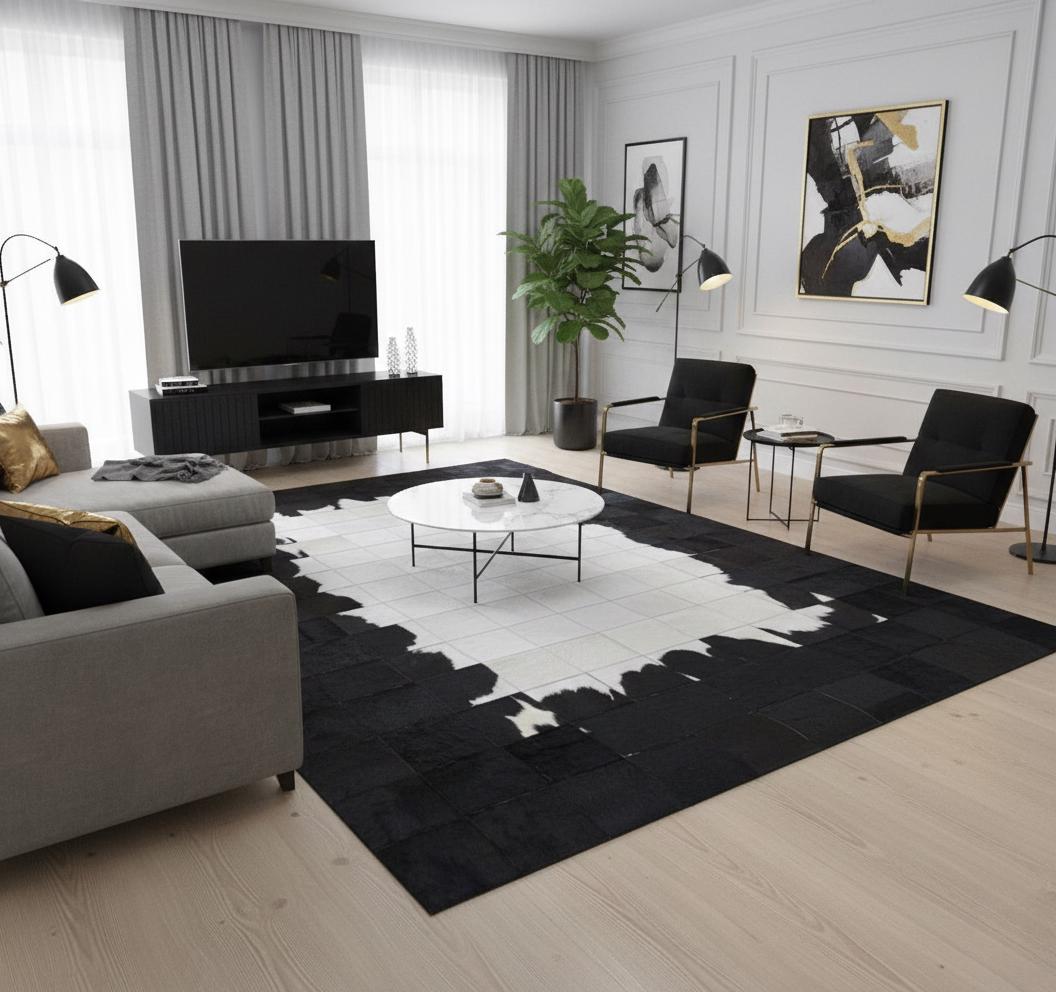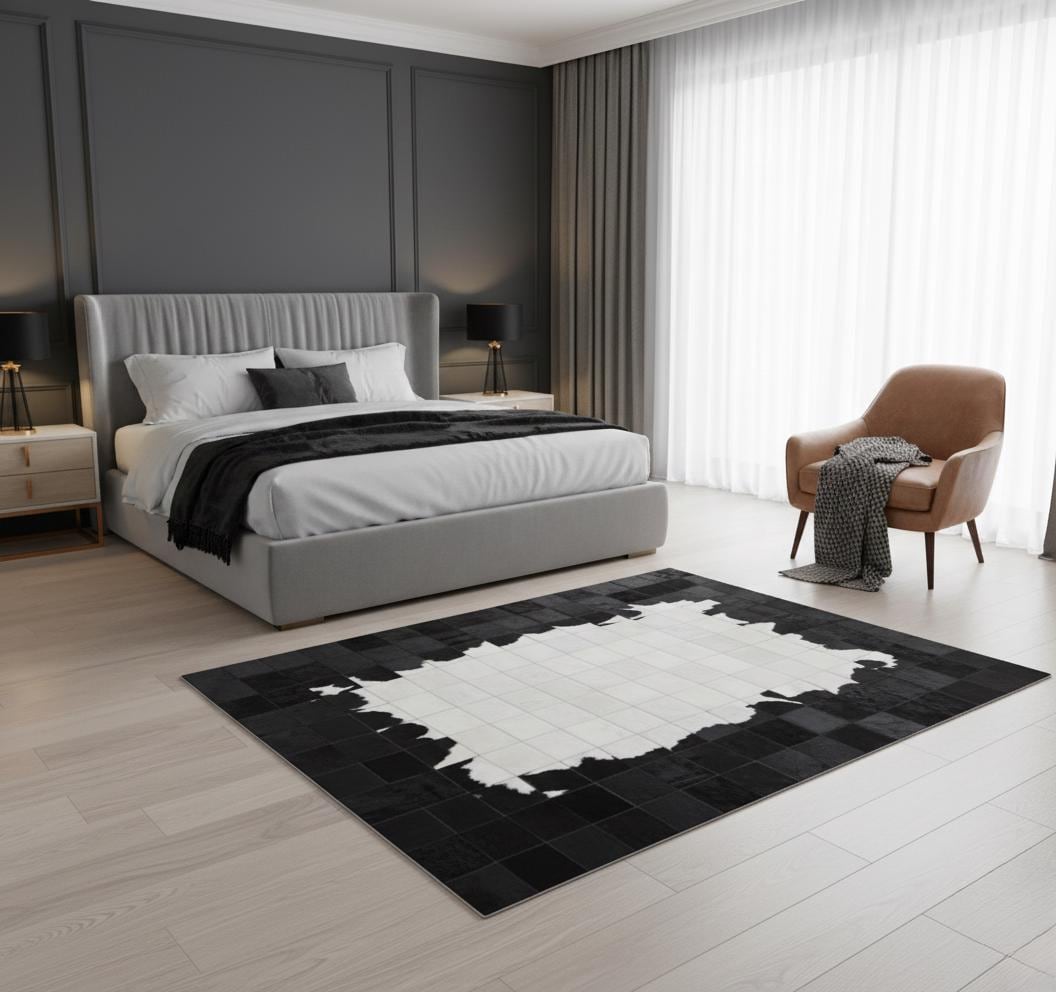 Siyah ve beyaz tonların kontrast uyumuyla hazırlanan dana derisi patchwork halı, dengeli ve net bir yüzey görünümü sunar. Gerçek dana derisinden üretilen bu halı, doğal dokusu ve sağlam yapısıyla öne çıkar.