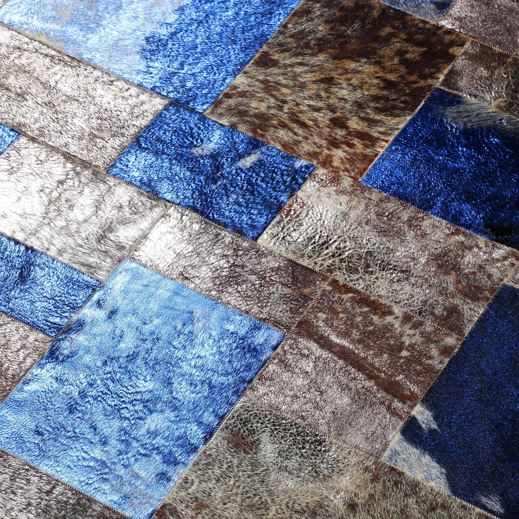 Parlak Mavi Kahve Dana Derisi Patchwork Halı – El Dokuma Hakiki Deri Dekoratif Koridor Halısı