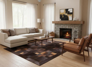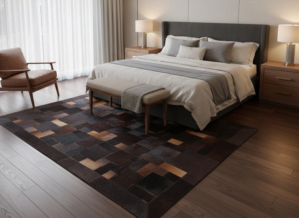 Koyu Kahverengi Tonlu Dana Derisi Patchwork Halı – El Yapımı Doğal Deri Dekoratif Halı