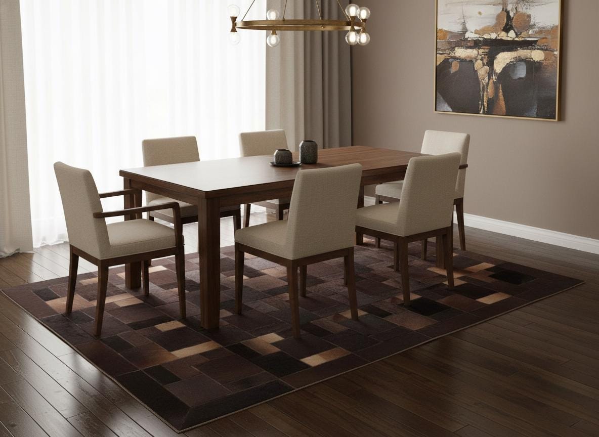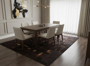 El yapımı dana derisi patchwork halı, koyu kahverengi tonların doğal geçişiyle hazırlanmıştır. Gerçek dana derisinden üretilen bu halı, güçlü dokusu ve doğal yüzeyiyle dikkat çeker.
