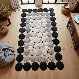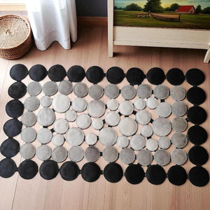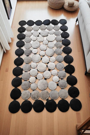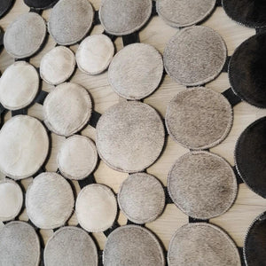 Siyah ve gri renkli daire desenli bu dana derisi halı, modern dekorasyonlarla uyum sağlar. El işçiliğiyle hazırlanmıştır.