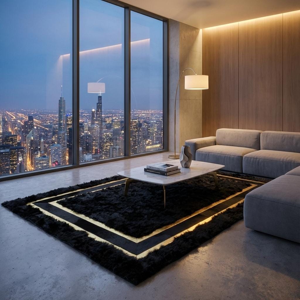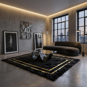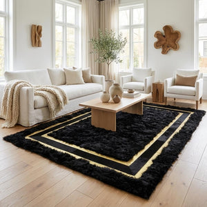 yumuşak halıToscana Siyah Doğal Kürk Halı, %100 doğal Toscana kuzu kürkünden üretilmiş, geniş ölçüsü ve çerçeve formundaki altın sarı detaylarıyla büyük salonlar ve yaşam alanları için tasarlanmış lüks bir dekorasyon parçasıdır. Derin siyah rengi, altın şeritli tasarımıyla birleşerek mekânda güçlü, sofistike ve dengeli bir odak noktası oluşturur.