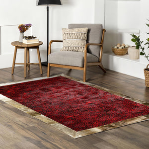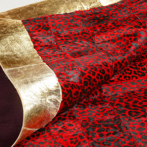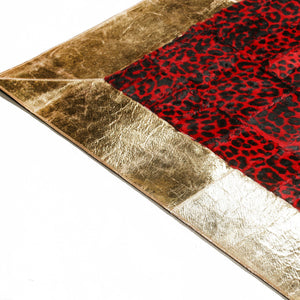 Altın Şeritli Kırmızı Dana Derisi Halı – El Dokuma Hakiki Deri Dekoratif Salon Halısı