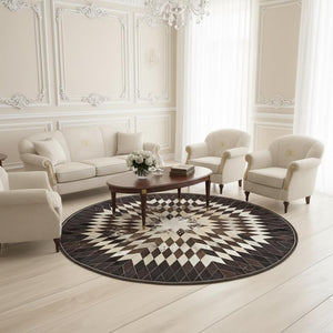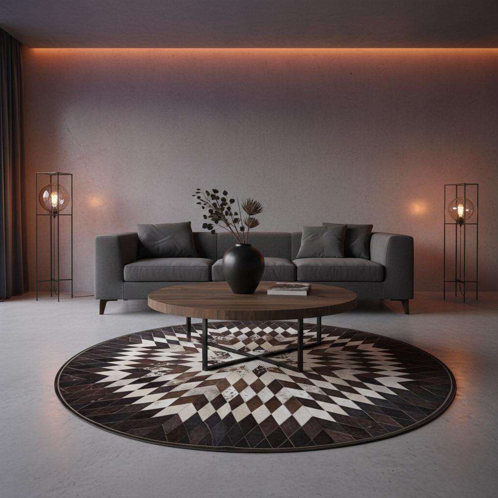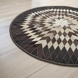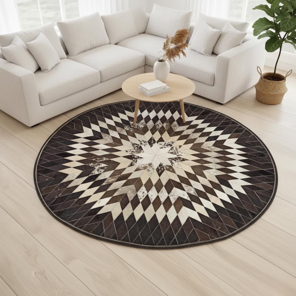 Siyah, krem ve kahverengi tonlarındaki dana derisi parçalarının merkezden dışa doğru dengeli bir şekilde yerleştirilmesiyle tasarlanan bu yuvarlak patchwork halı, doğal renk geçişleriyle güçlü bir görsel bütünlük sunar. Dairesel formu ve düzenli desen yapısı sayesinde yüzeyde net ve dengeli bir odak oluşturur.