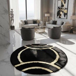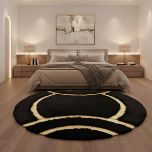 Siyah Zeminli Altın Akıcı Çizgi Desenli Yuvarlak Peluş Halı – Yumuşak Dokulu, Modern ve Dekoratif Halı