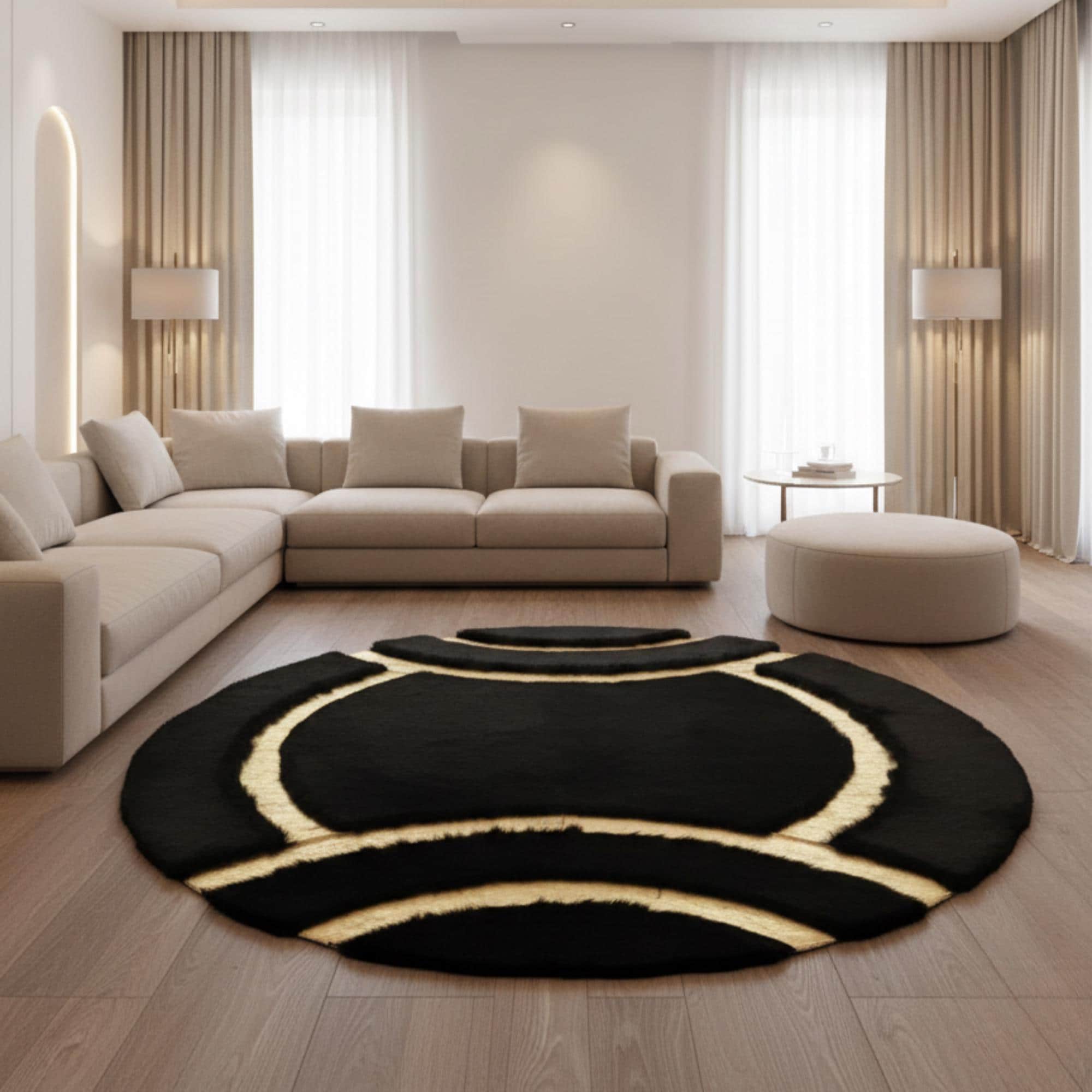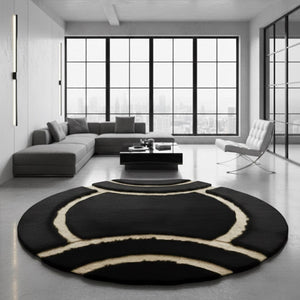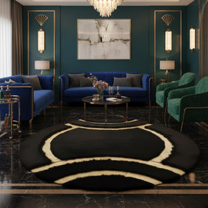 Siyah zemin üzerine altın akıcı çizgi desenleriyle tasarlanan bu yuvarlak peluş halı, dairesel formu ve dinamik çizgileriyle mekâna modern ve dikkat çekici bir görünüm kazandırır. Altın çizgiler yüzeyde akış hissi oluştururken, siyah zemin güçlü bir kontrast sağlayarak tasarımı öne çıkarır.
