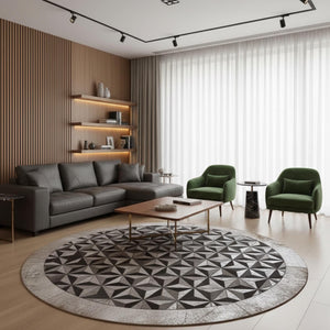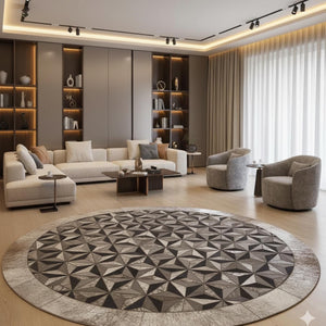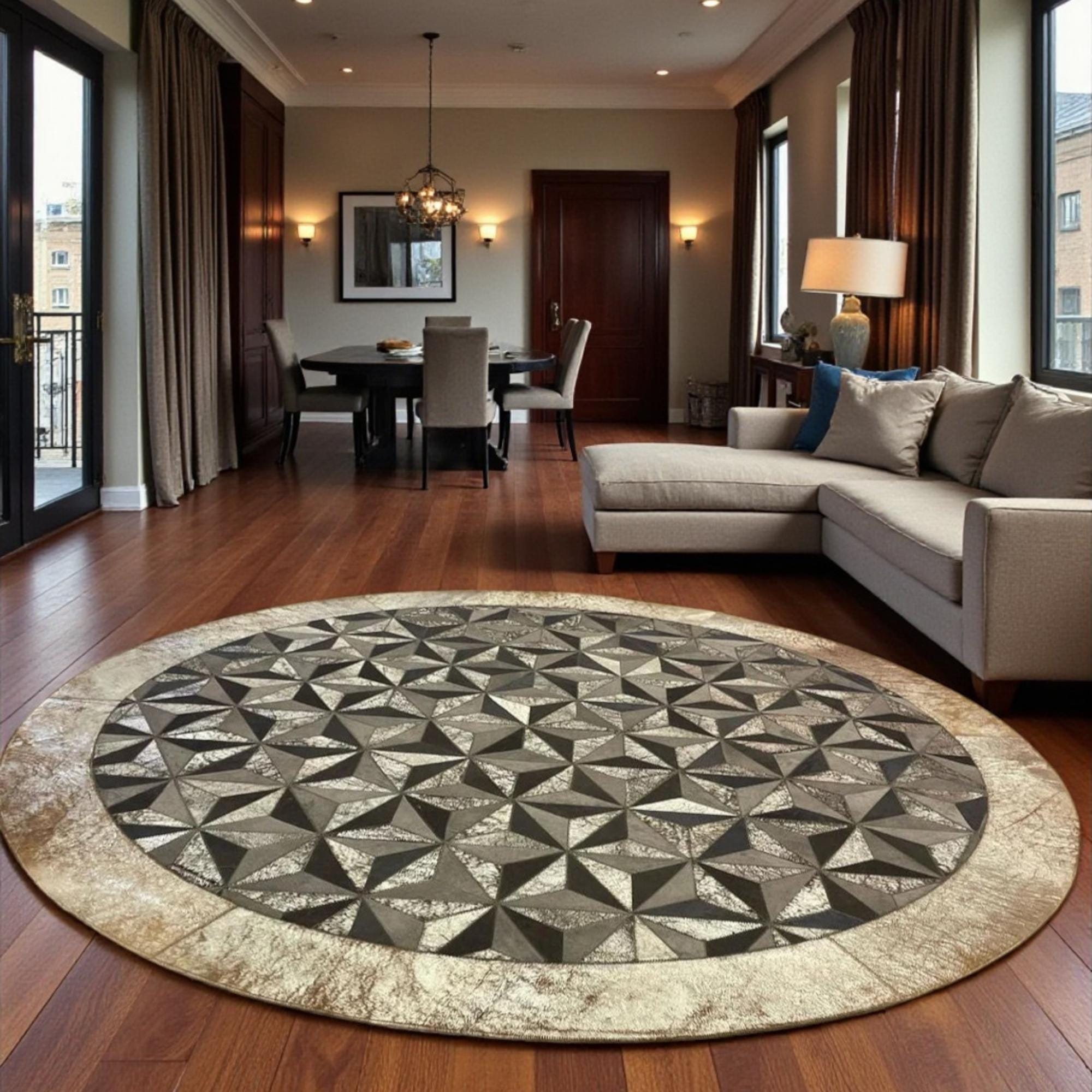 Krem, gri ve siyah tonlarındaki dana derisi parçalarının geometrik bir düzenle bir araya getirilmesiyle tasarlanan bu yuvarlak patchwork halı, güçlü kontrastı ve dengeli kompozisyonuyla dikkat çeker. Merkezden çevreye doğru ilerleyen desen yapısı yüzeyde net ve düzenli bir odak noktası oluşturur.