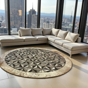 Krem, Gri ve Siyah Tonlarında Yuvarlak Dana Derisi Patchwork Halı