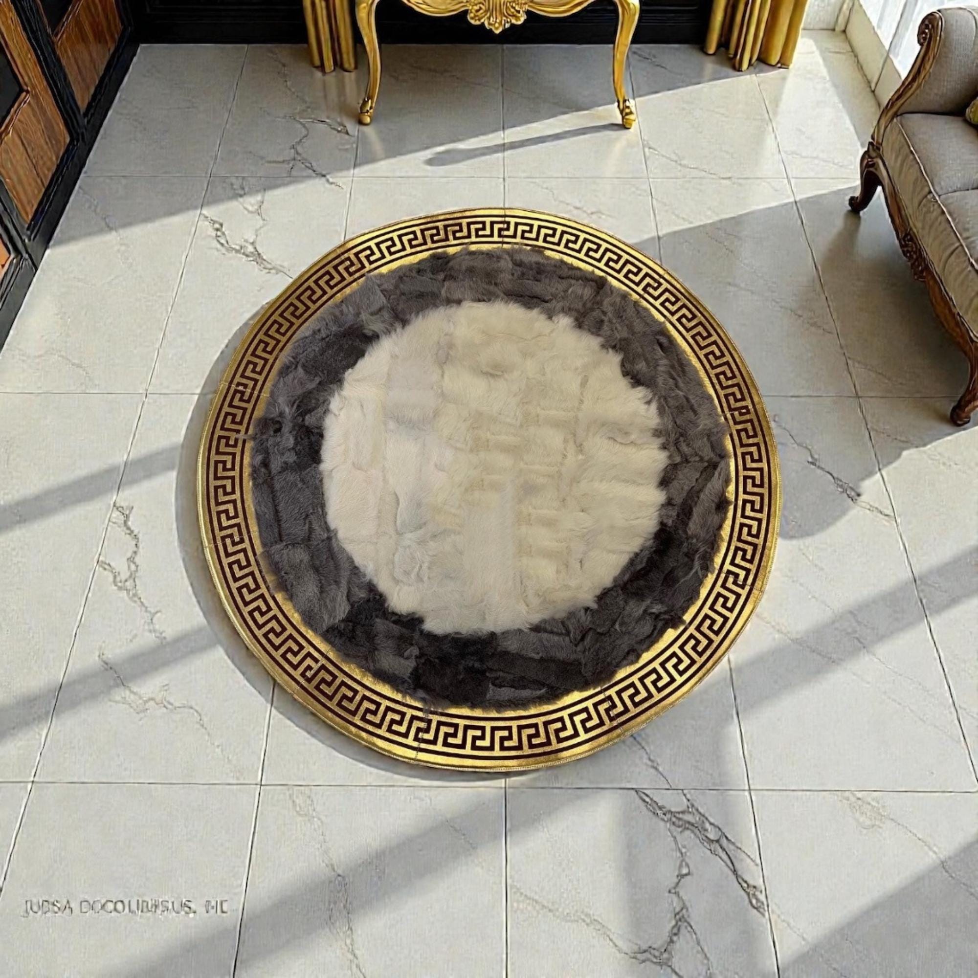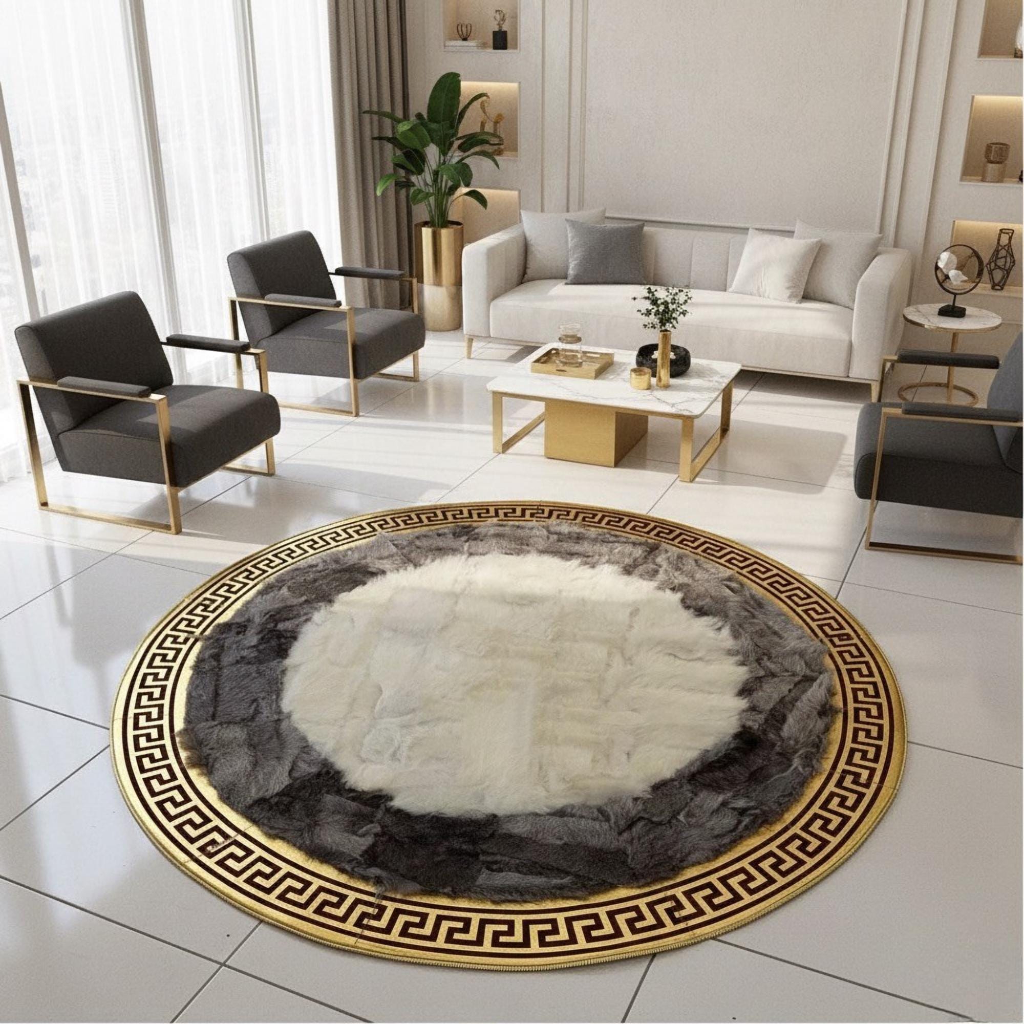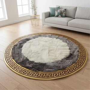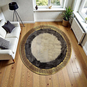 Beyaz Merkezli Gri Zeminli Altın Bordür Detaylı Yuvarlak Toskana Halı