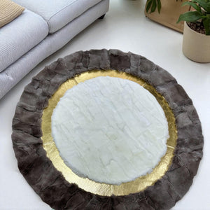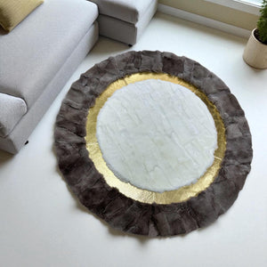 Bu yuvarlak dana derisi halı, el işçiliğiyle hazırlanmış olup doğal yapısıyla dikkat çeker.