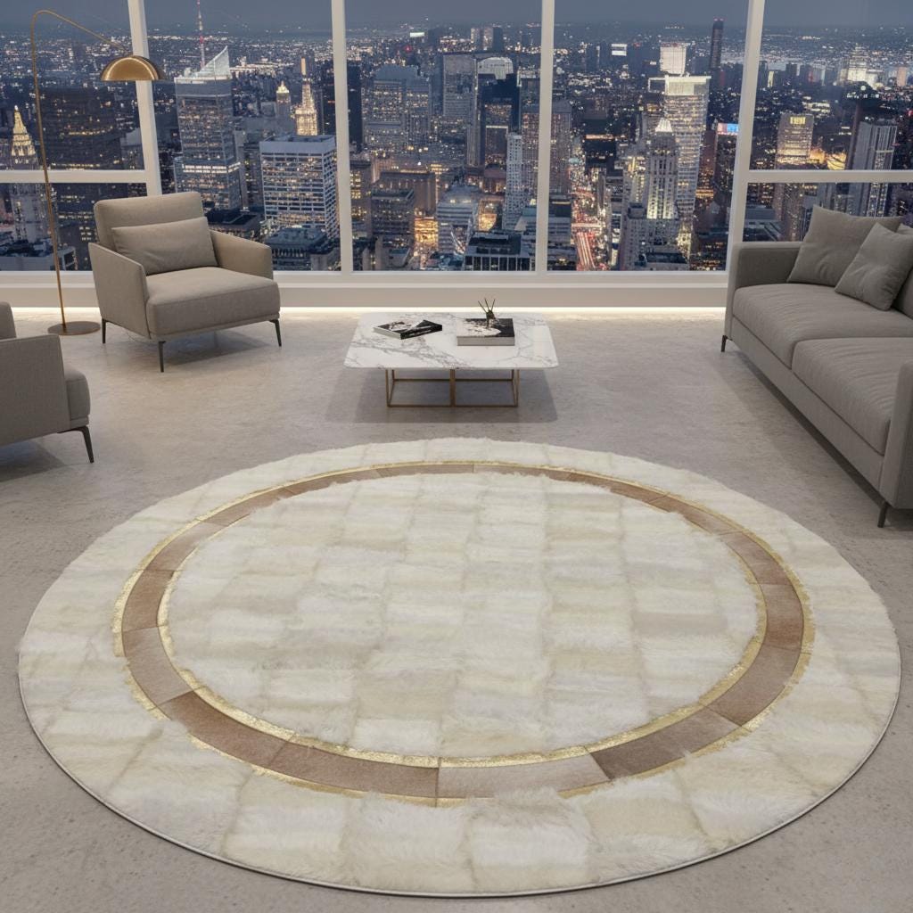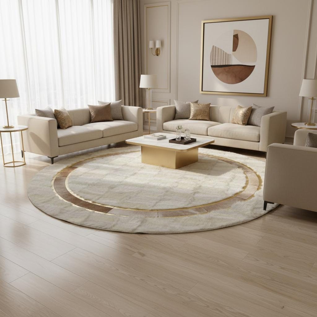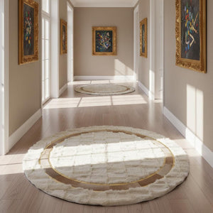 Beyaz Toskana zemin üzerine yerleştirilmiş açık kahverengi çember detayıyla tasarlanan bu yuvarlak halı, sade yüzeyi dengeli bir merkez vurgusuyla tamamlar. Çember form, halıya net bir odak kazandırırken yuvarlak yapıyla bütünlüklü ve düzenli bir görünüm sunar.