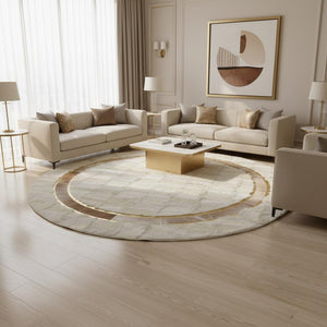 Beyaz Zeminli Açık Kahverengi Çember Detaylı Yuvarlak Toskana Halı