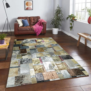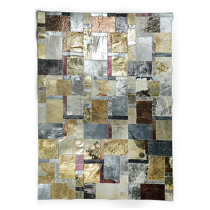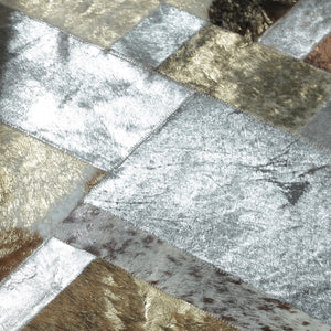 Altın & gümüş tonlara sahip bu dana derisi halı, doğal dokusu ve şık görünümüyle dikkat çeker.