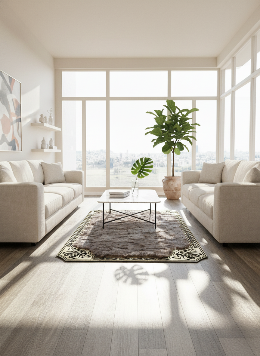 Bu açık kahverengi Toskana halı, doğal kürk dokusunun sunduğu sıcaklık ve yumuşaklığı modern altın çerçeve tasarımıyla bir araya getirir. Yoğun ve dolgun yüzeyi adım attığınız anda konforlu bir his sunarken, doğal renk geçişleri halıya zarif ve zengin bir görünüm kazandırır.