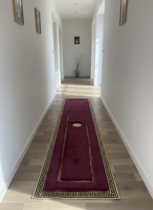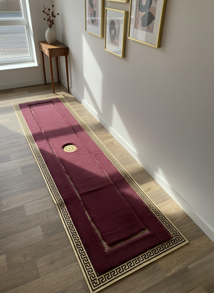 Altın ve siyah desenlerle tasarlanmış çerçevesi halıya sofistike bir karakter kazandırır. Uzun formu sayesinde geçiş alanlarında hem dekoratif hem işlevsel bir tamamlayıcı olarak öne çıkar.