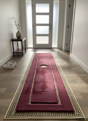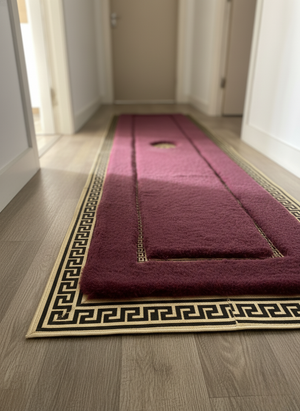 Bordo Peluş Halı – Altın-Siyah Desenli, Ultra Yumuşak ve İz Yapmayan Doku, Kaymaz Taban – Özel Ölçü Seçenekleri