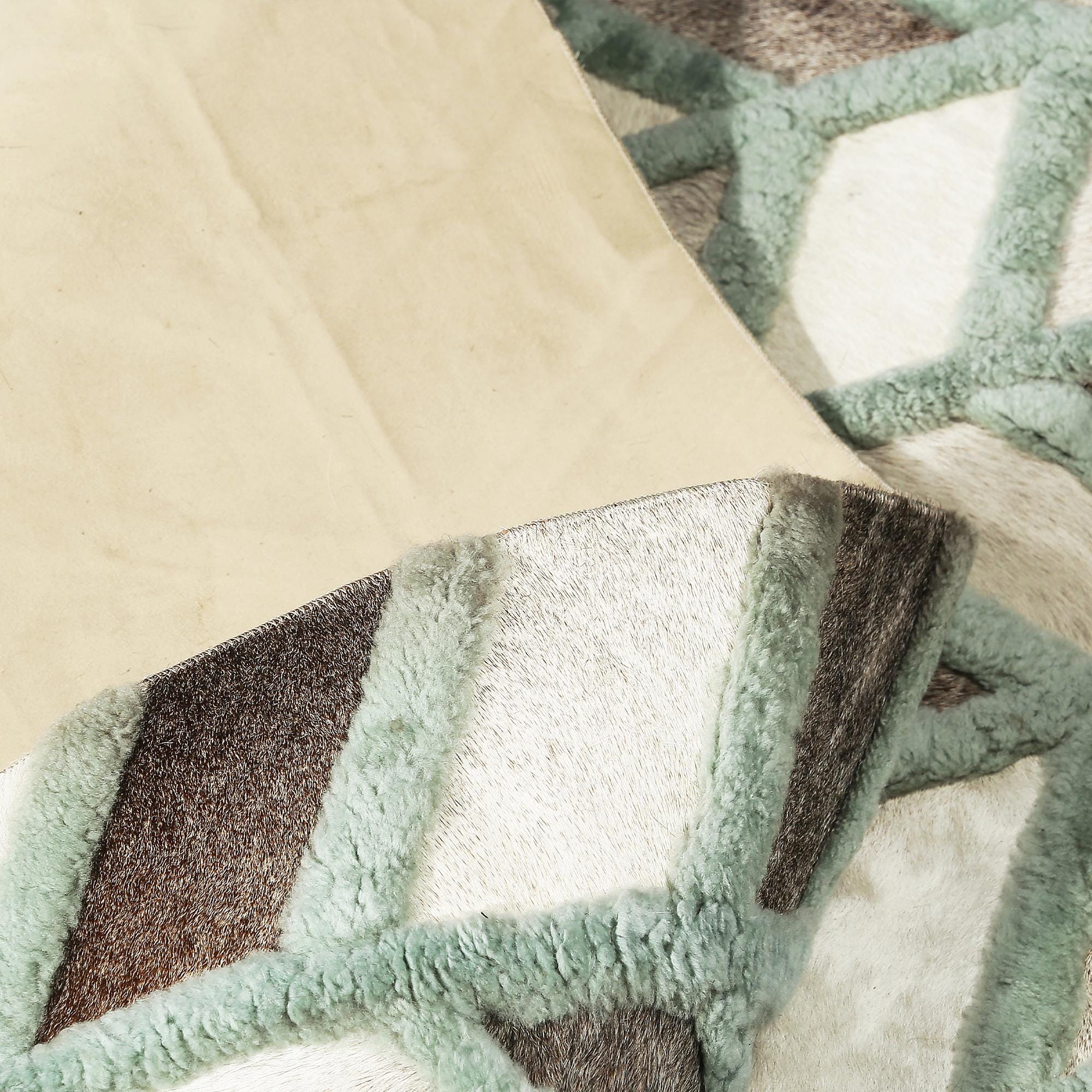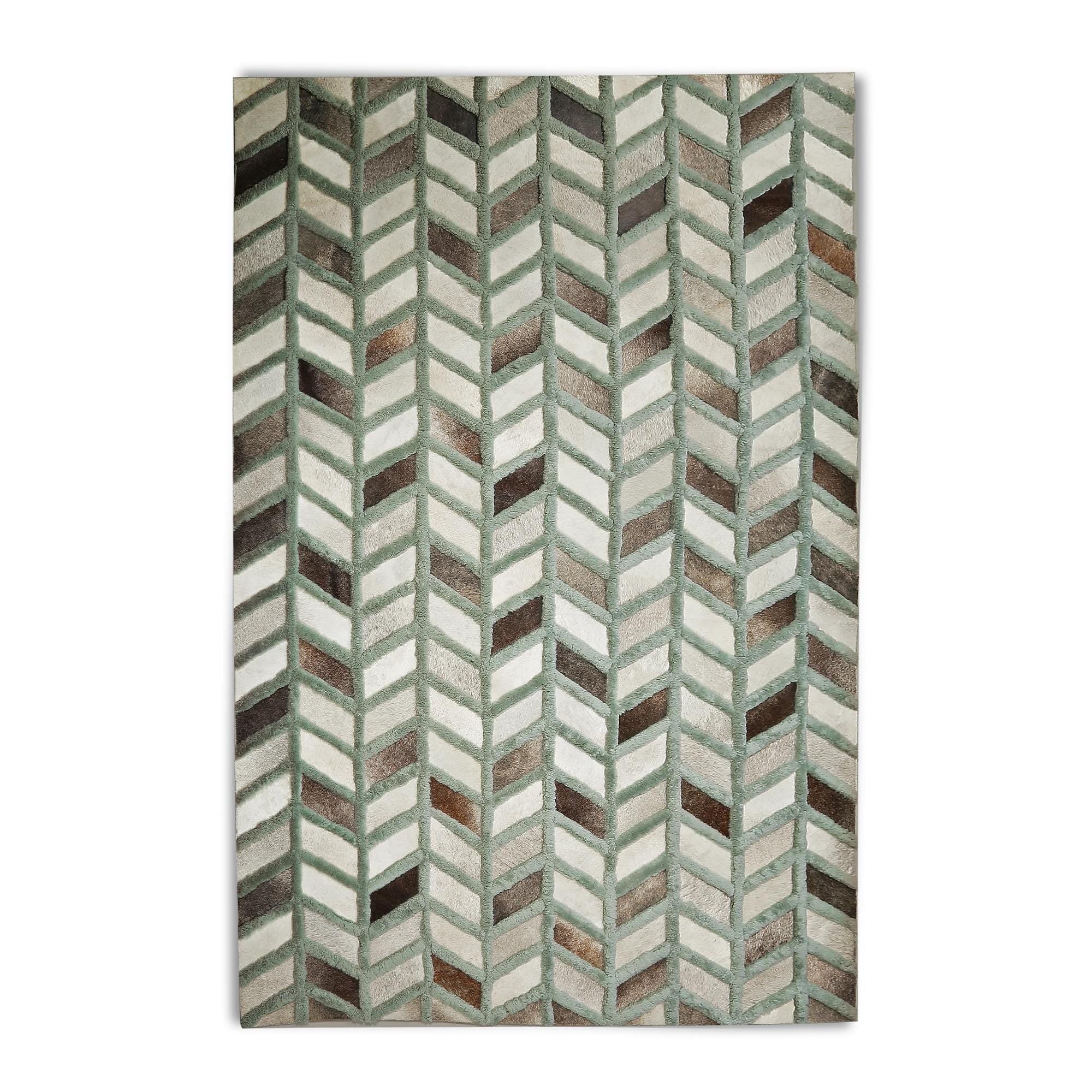 Üç renkli tonlara sahip bu dana derisi halı, doğal dokusu ve şık görünümüyle dikkat çeker.