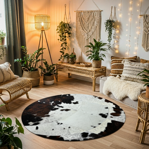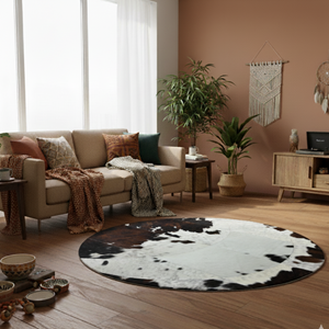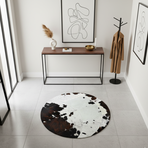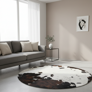 Ana Sayfa Yuvarlak Patchwork Dana Derisi Halı – Siyah Beyaz Kahverengi