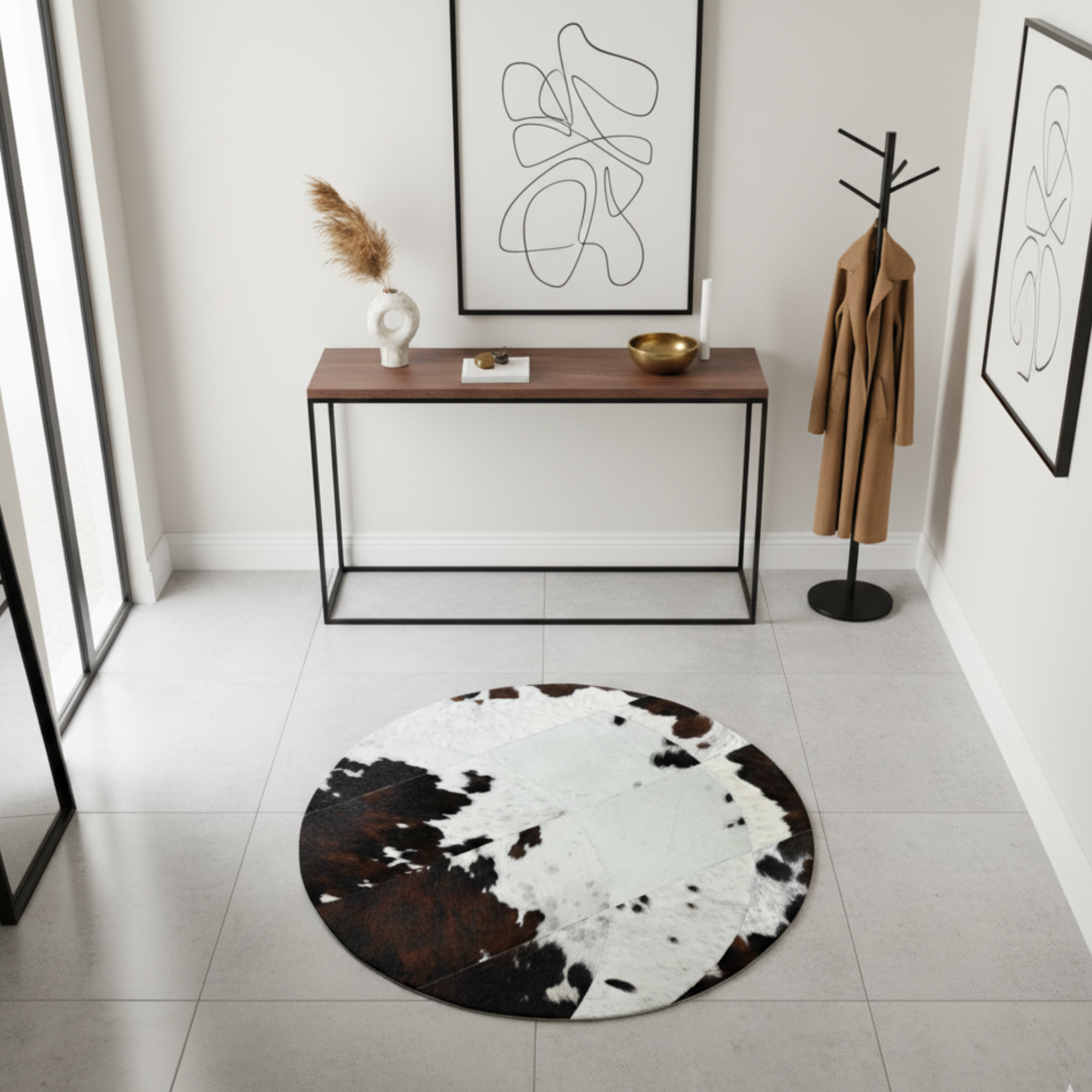 Yuvarlak Patchwork Dana Derisi Halı – Siyah Beyaz Kahverengi
