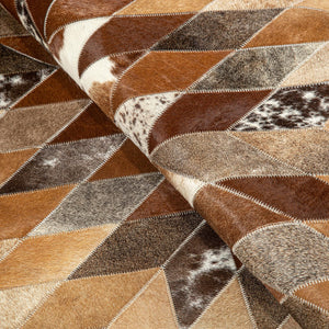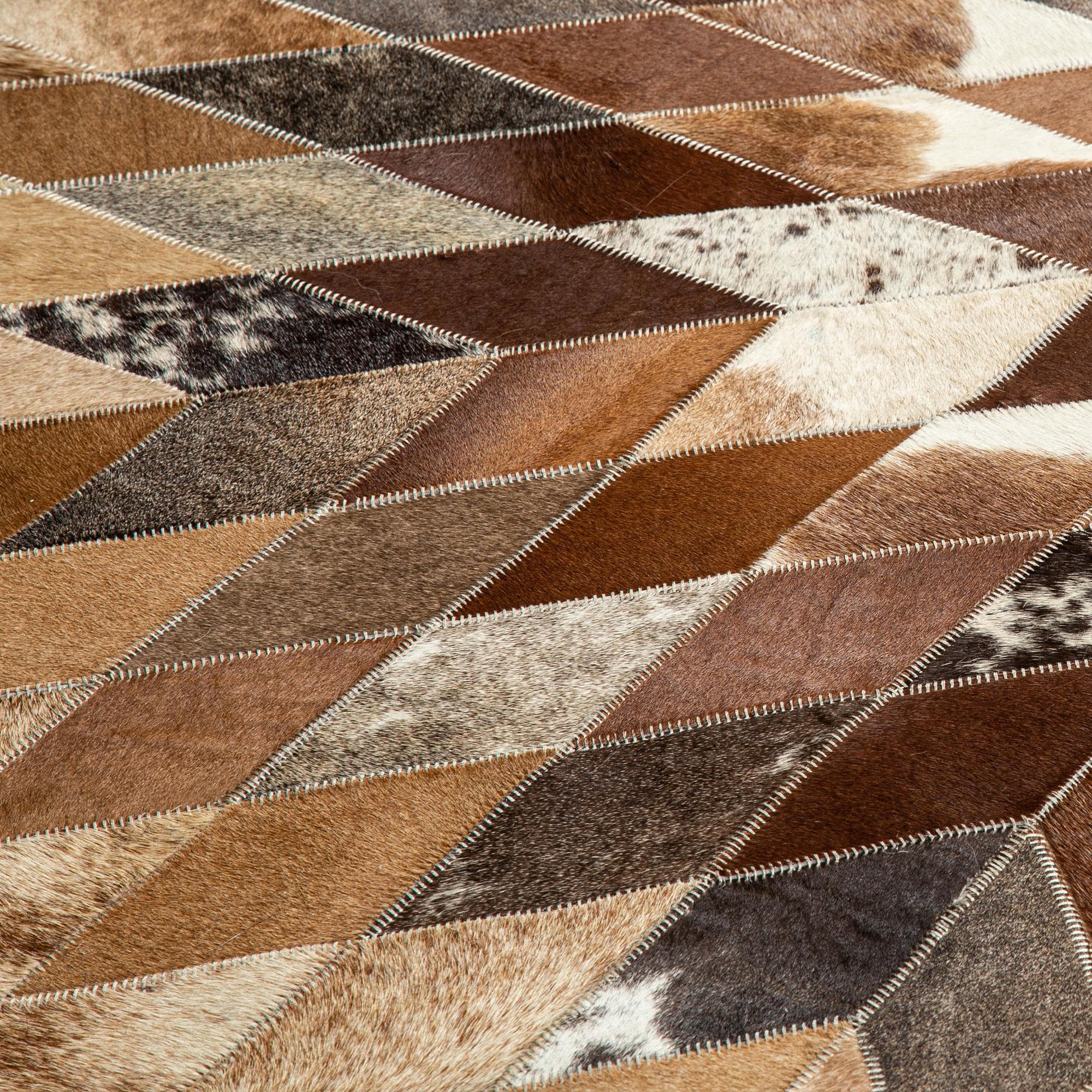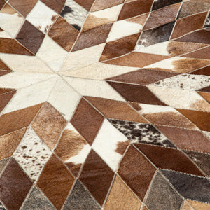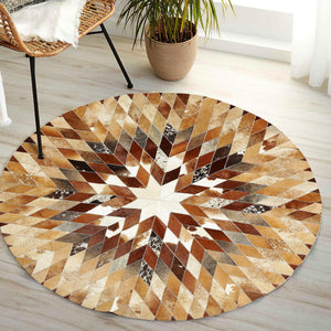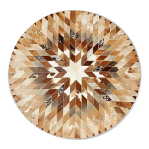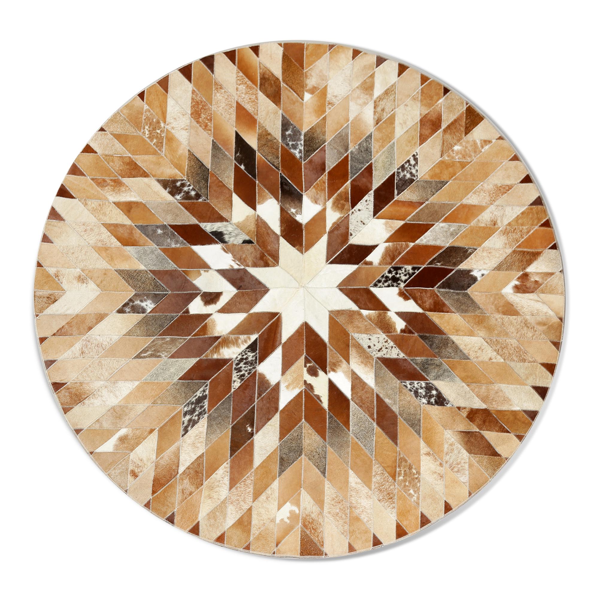 Texas yıldız motifiyle tasarlanmış bu yuvarlak dana derisi halı, el işçiliğiyle üretilmiştir.