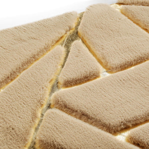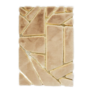 Bu kahverengi zemin üzerine altın detaylı peluş halı, modern geometrik tasarımıyla öne çıkar. Yumuşak dokusu ve dayanıklı yapısıyla hem şıklık hem de rahatlık sunar.