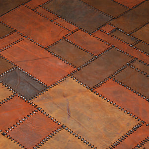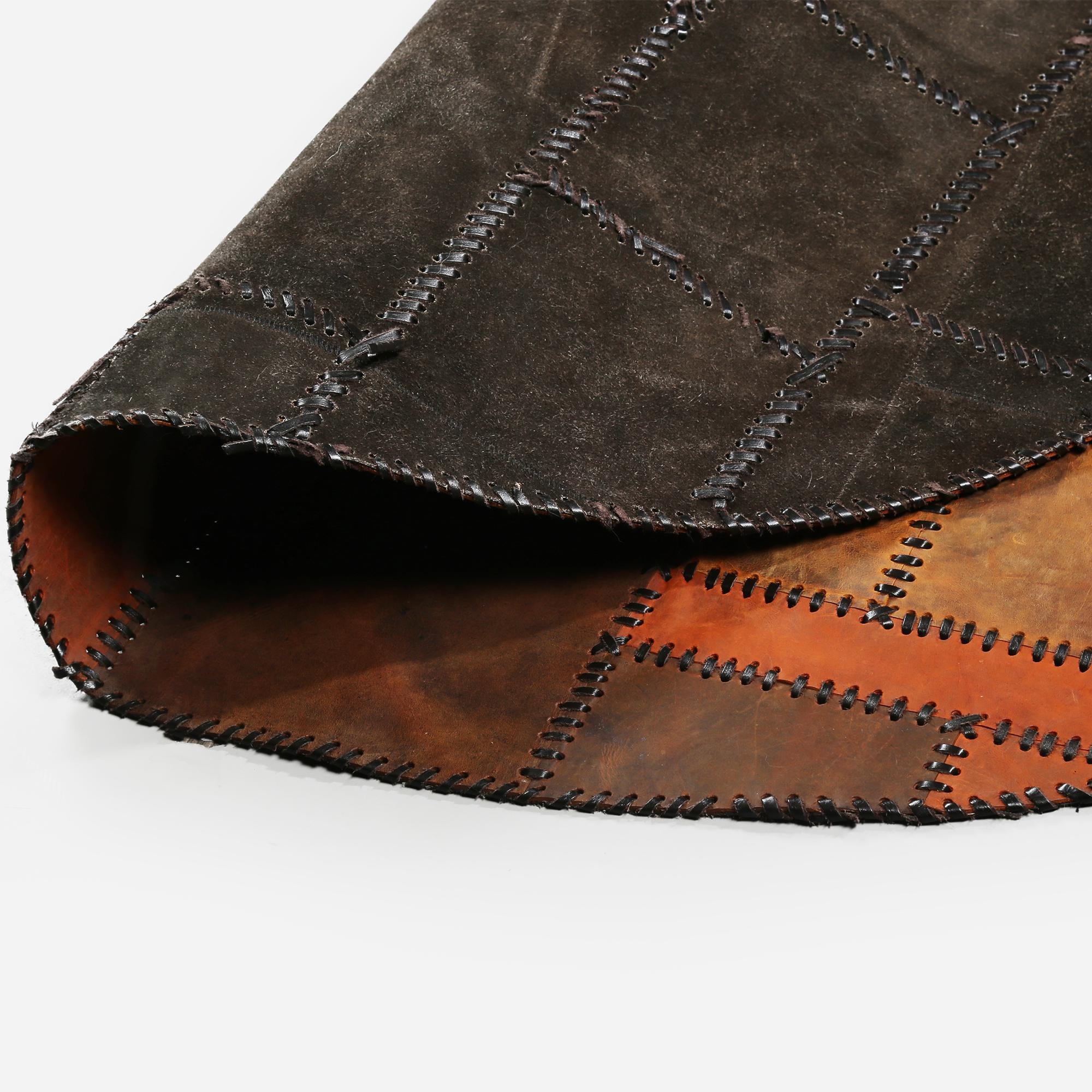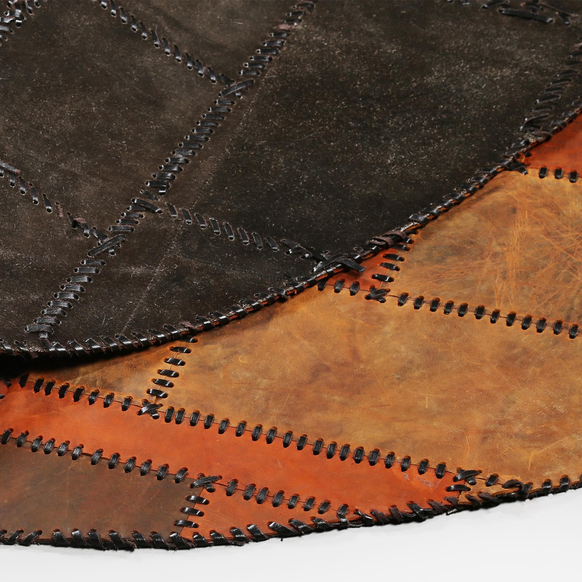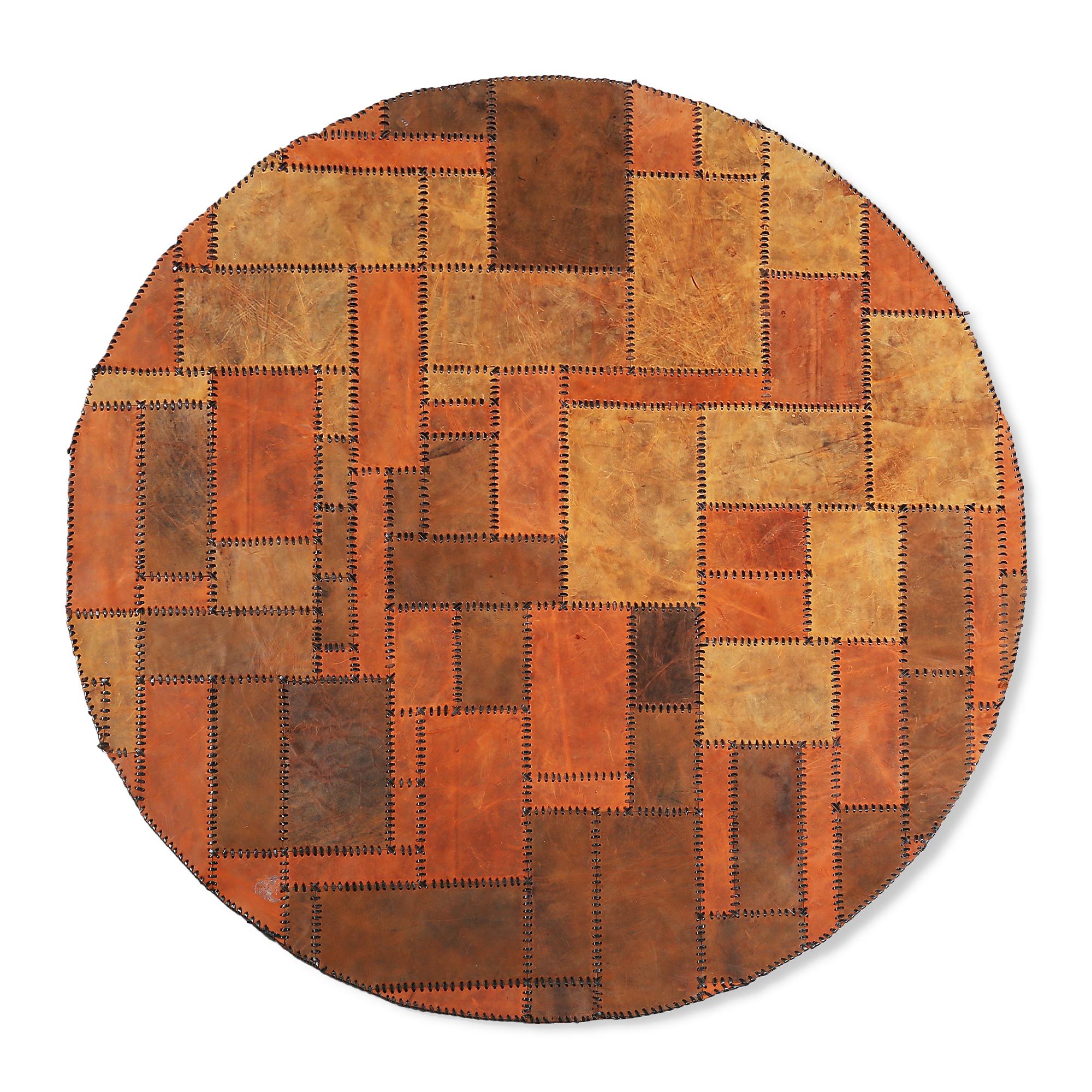 Bu yuvarlak dana derisi halı, el işçiliğiyle hazırlanmış olup doğal yapısıyla dikkat çeker.