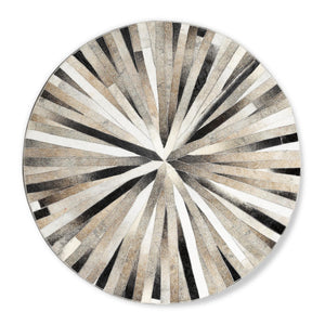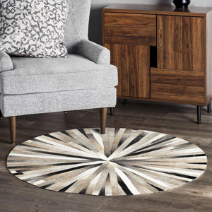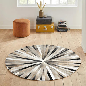 Krem Siyah Beyaz Üç Renkli Yuvarlak Dana Derisi Halı – El Yapımı Doğal ve Şık Salon Halısıh