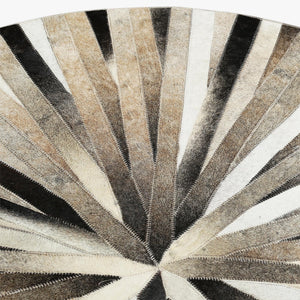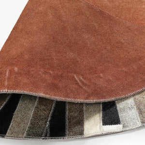 Bu yuvarlak dana derisi halı, el işçiliğiyle hazırlanmış olup doğal yapısıyla dikkat çeker.
