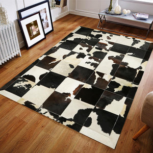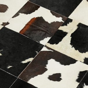 Üç Renkli Siyah Beyaz Kahverengi Dana Derisi Halı – El Yapımı Hakiki Deri Patchwork Salon Halısı