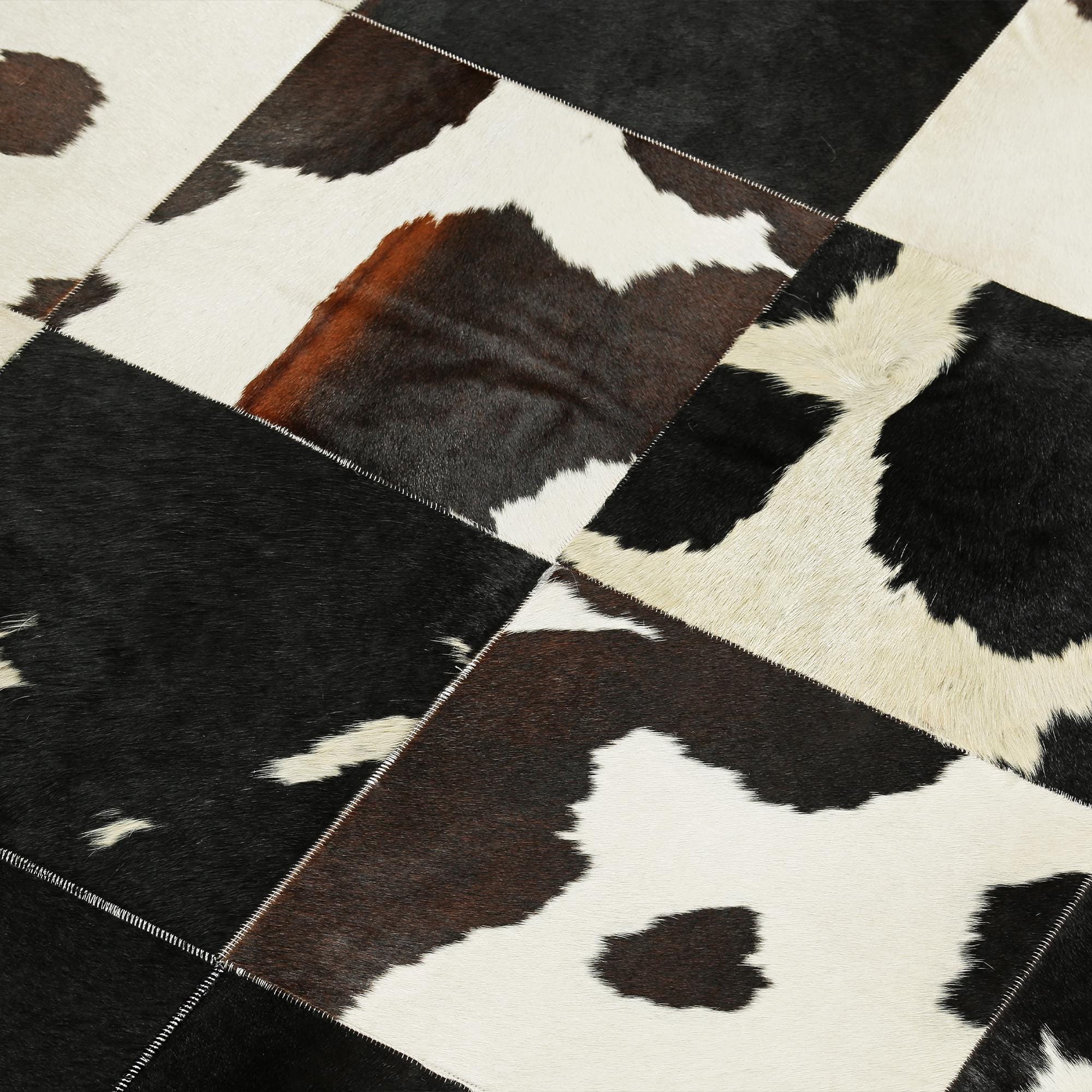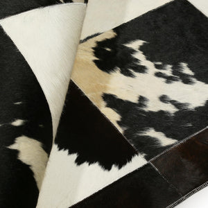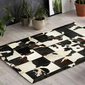 Siyah & beyaz & kahverengi & doğal & üç renkli tonlara sahip bu dana derisi halı, doğal dokusu ve şık görünümüyle dikkat çeker.