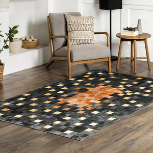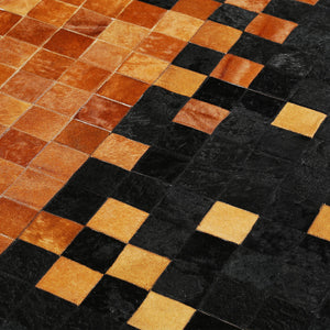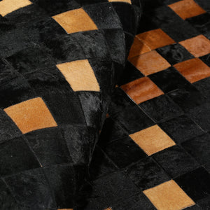 Siyah & kahverengi & üç renkli tonlara sahip bu dana derisi halı, doğal dokusu ve şık görünümüyle dikkat çeker.