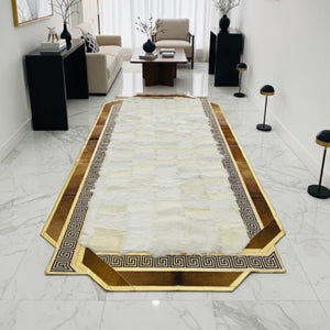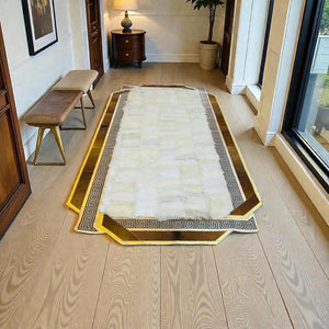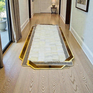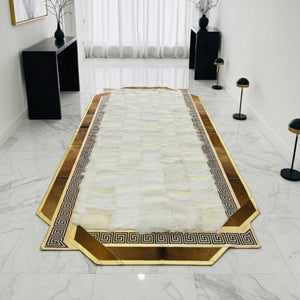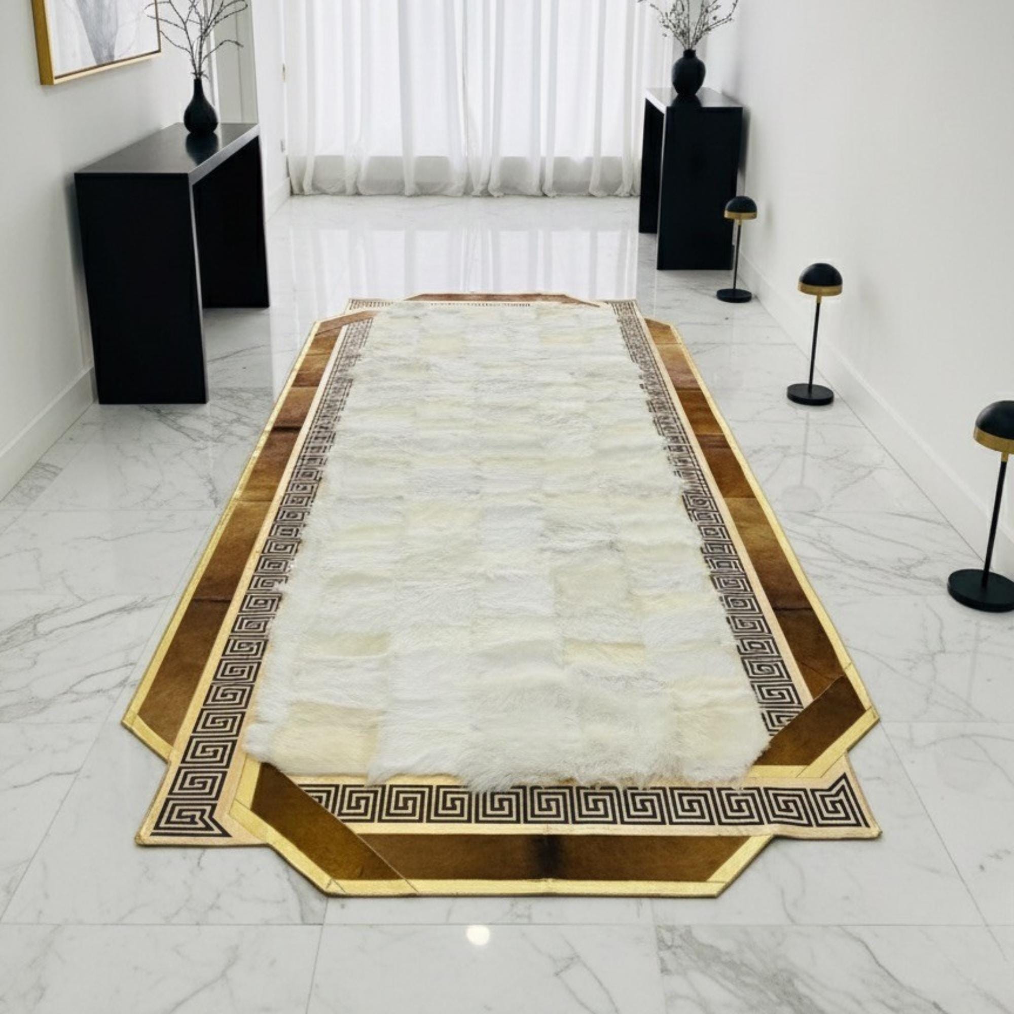 Doğal Toscana kürkünden üretilen bu uzun koridor halısı, krem zemin rengi ve kahverengi ile altın tonlarının zarif birleşimi sayesinde geçiş alanlarına şık ve prestijli bir görünüm kazandırır. Açık krem tonların aydınlık etkisi, koyu çerçevenin derinliği ve altın bordürün zarafetiyle dengelenerek mekânda düzenli ve sofistike bir atmosfer oluşturur. Toscana kürkünün yumuşak ve ipeksi dokusu, halıya konforlu bir his kazandırırken uzun formu sayesinde koridor ve antre alanlarını estetik bir bütünlükle tamamlar.