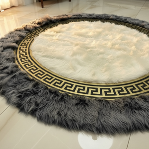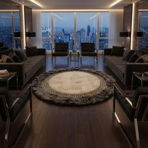 Krem merkez alanı çevreleyen koyu gri Toskana zemin ve altın çerçeve detayıyla tasarlanan bu yuvarlak halı, güçlü bir kontrast ve net bir çerçeve etkisi sunar. Merkezden çevreye doğru kurgulanan yapı, yüzeyde düzenli ve dengeli bir görünüm oluşturur.